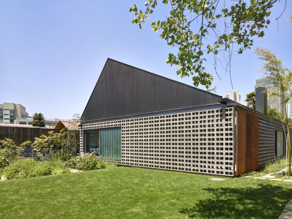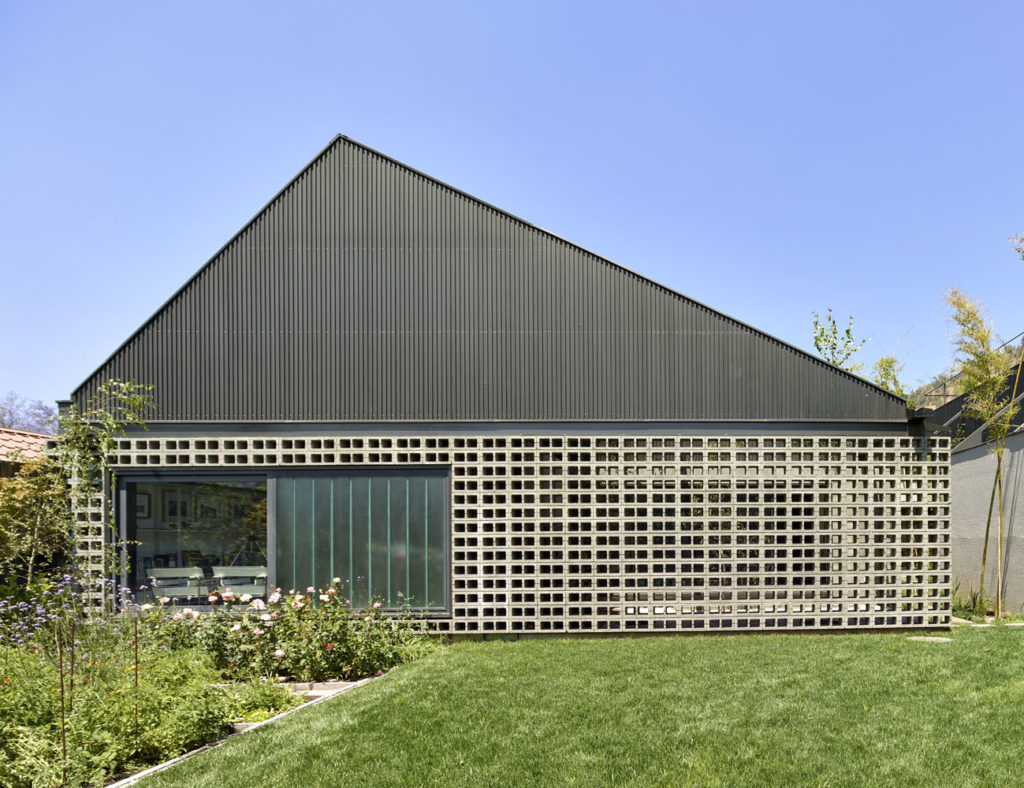 Outside, it was clad with thermal insulation and a layer of exposed blocks which unify the volume and give it an abstract quality that allows it to coexist with the adjacent house.