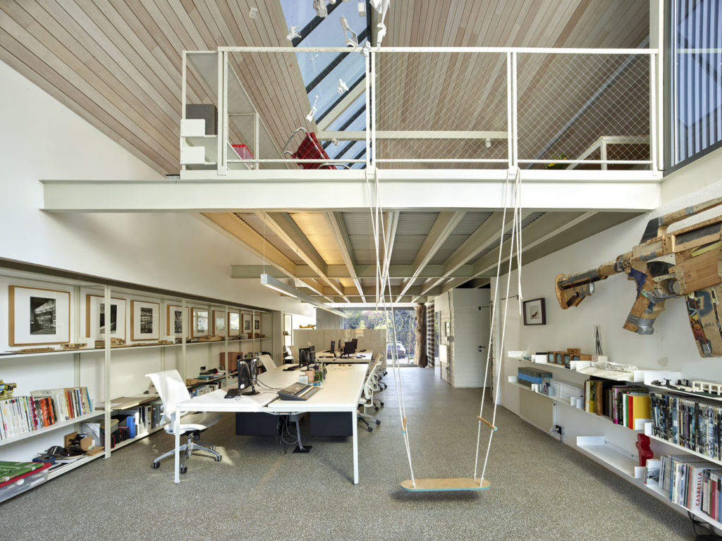 Internally, on ground floor, we find the original brick-work walls linked by an exposed steel structure. On the upper level, the flooring is a continuous epoxy paint, which reflects the light and contrasts with the timber ceiling.