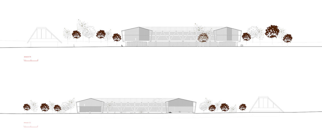 The buildings are proposed in reinforced concrete for the first floor (frames and slab) and laminated wood for upper floors with CLT panels for enclosures. This ensures that the wood is kept off the ground and is highlighted in the cleaner upper level programs. The use of CLT Panels (Cross Lumber Timber) allows the elimination of transversal stiffening elements so that the structural “skeleton” is visually cleaner and therefore gives greater flexibility to the layout of each level.