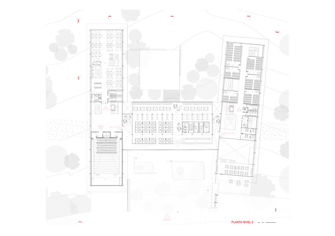 As a way of strengthening the university life in all its strata, the bars have some vertical patios in which a kind of living rooms are cornered over gardens that incorporate native vegetation and allow a fluid spatial integration of the different levels, emphasizing the idea of integration that the campus intends, even in the smaller scale spaces.