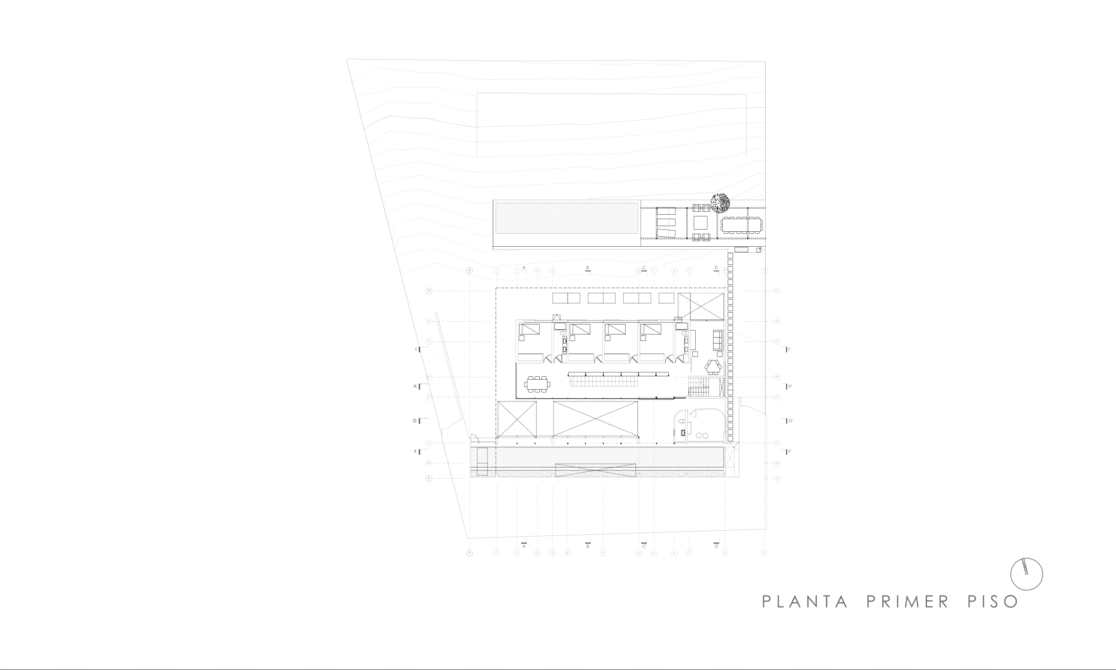 The single-family program is designed on its first level from a succession of rooms for children, the semi-olympic heated pool and the engine room. Here is where the patio is generated and perceived, which maintains the relationship with the hill and at the same time acts as a light source for the different rooms on each level. The upper floor is organized from the aforementioned light patio based on 2 volumes: one, the one that houses the program of the main room, bathroom and study, and the other that’s made up by the kitchen and services. The void that remains between these volumes is a succession of common fluid spaces, such as a terrace, living room, corridors and the library. The latter is designed as a multifunctional programmatic element by functioning as a screen between the patio of light and the exterior, being the connector in its vertical sense with the main staircase and finally as a piece of furniture that arranges the books.