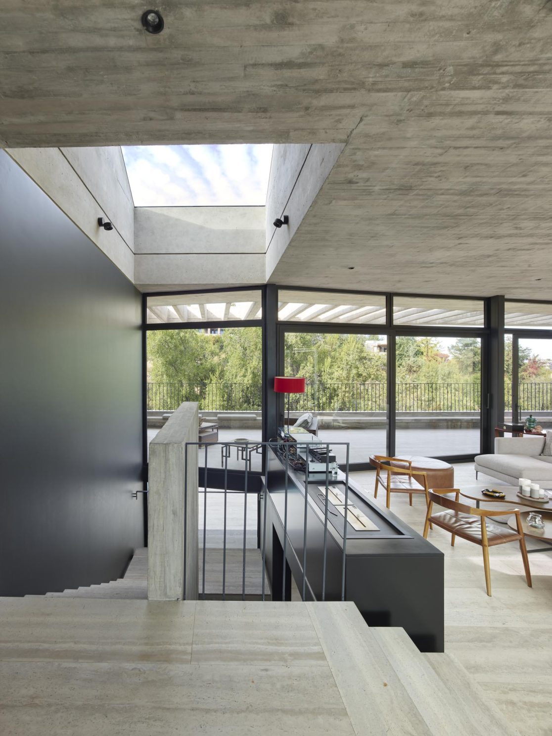 La casa se resuelve constructivamente en hormigón armado en su totalidad, y para ganar luz natural, una serie de tragaluces aparecen en la cubierta para este fin.