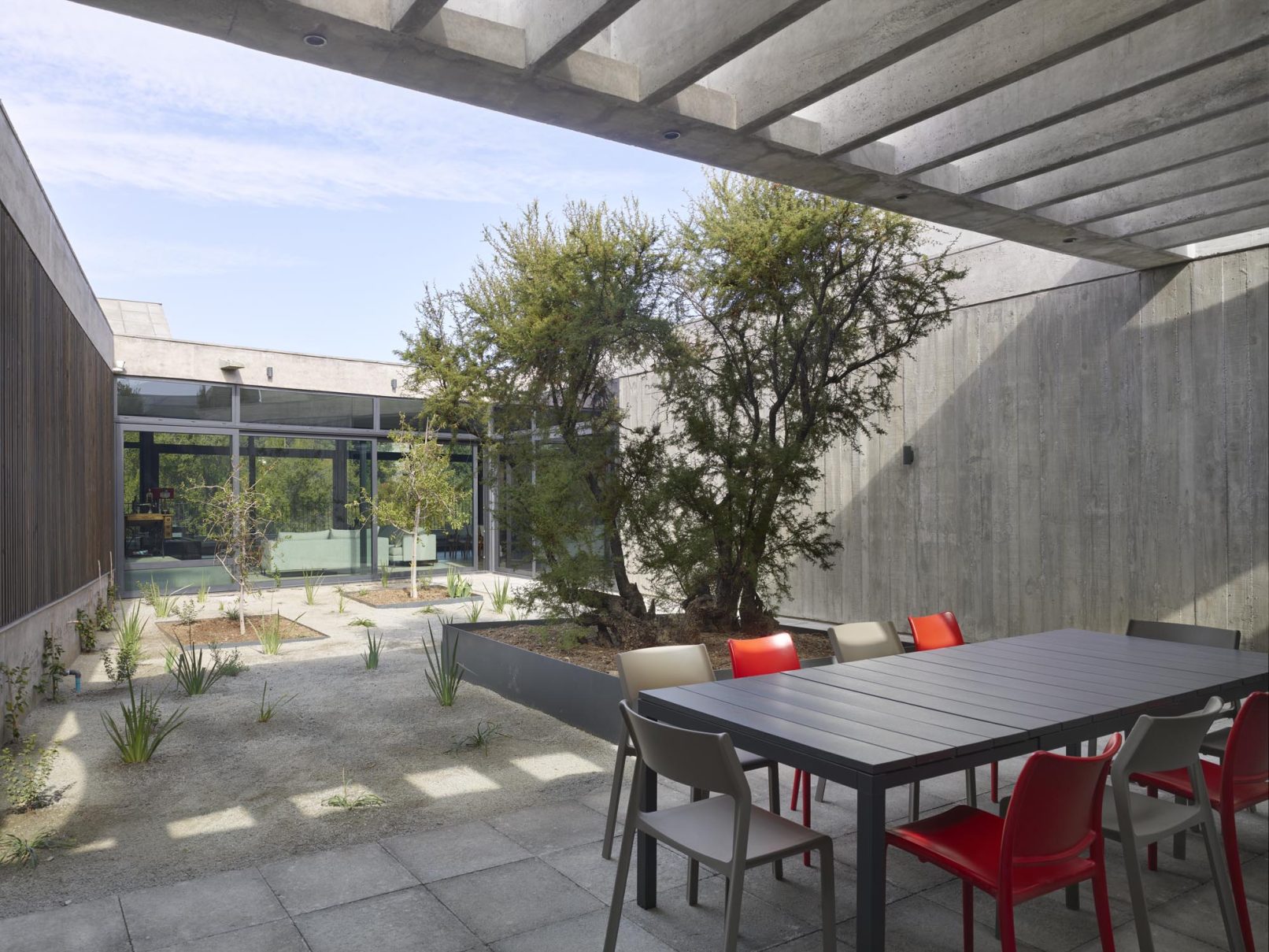La casa se organiza en torno a un patio central a nivel de terreno, que conserva un par de espinos preexistentes en terreno. Hacia el oriente las habitaciones , al poniente el servicio y con orientación norte sur el estar comedor