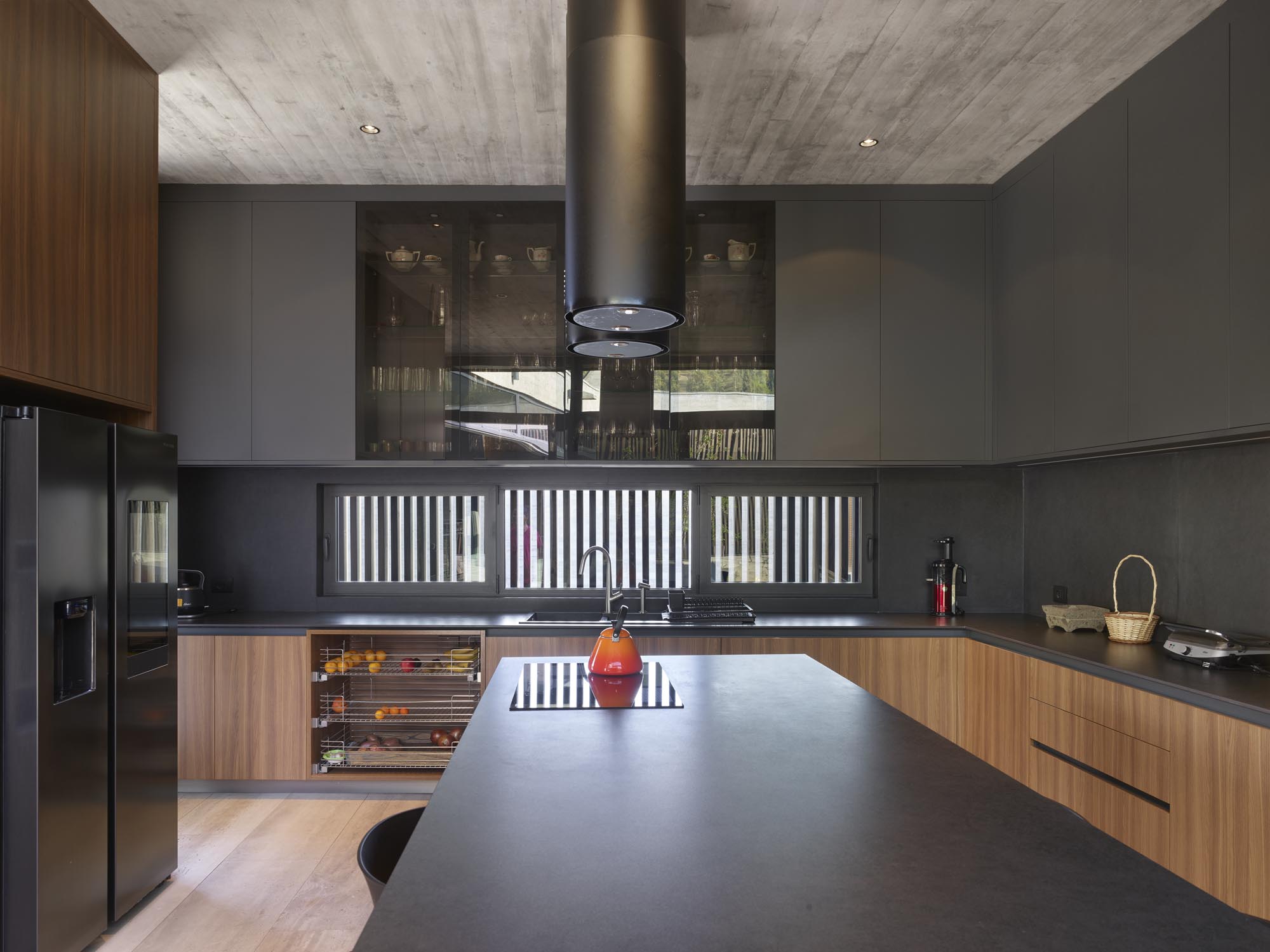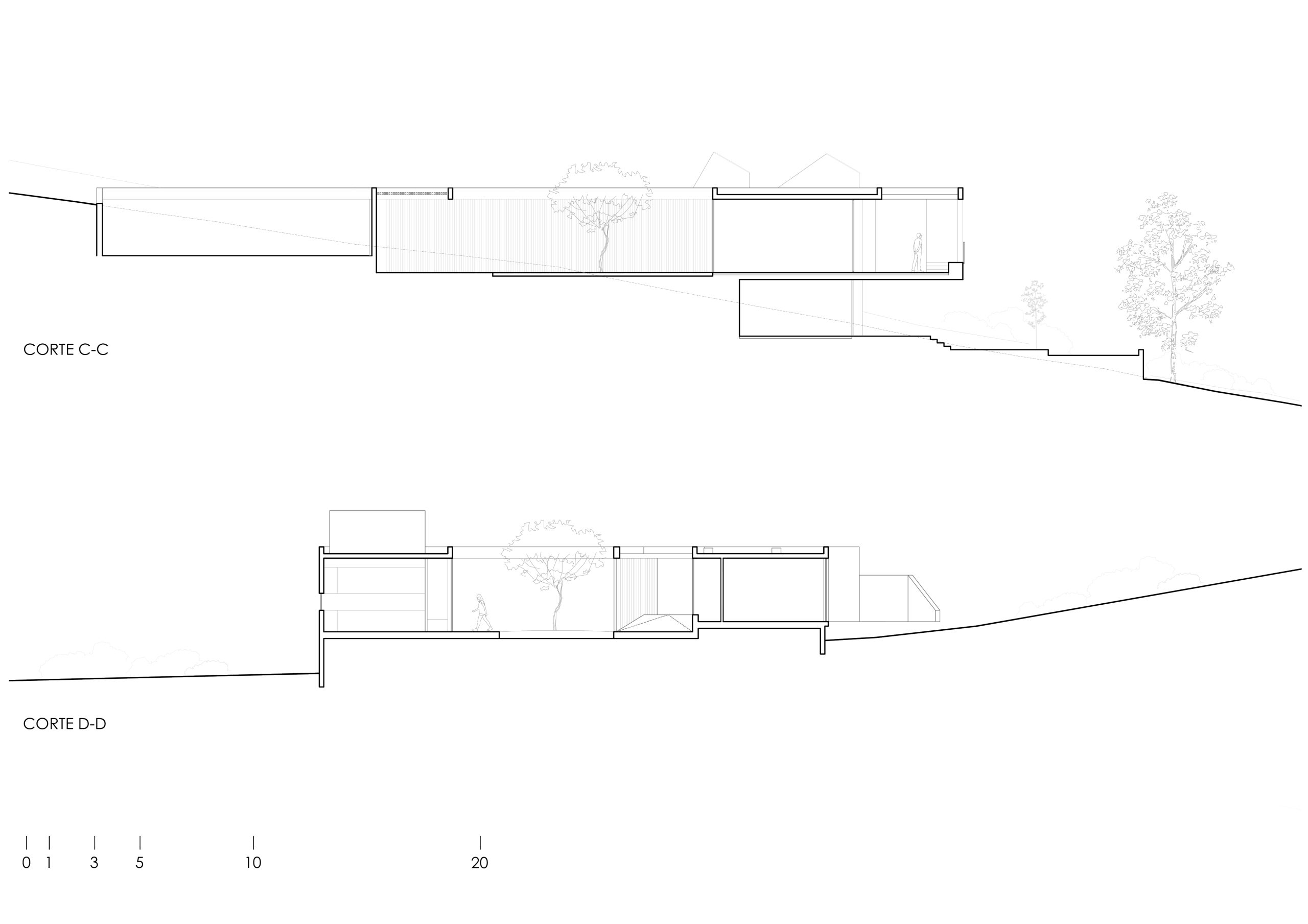 La casa se resuelve constructivamente en hormigón armado en su totalidad, y para ganar luz natural, una serie de tragaluces aparecen en la cubierta para este fin.