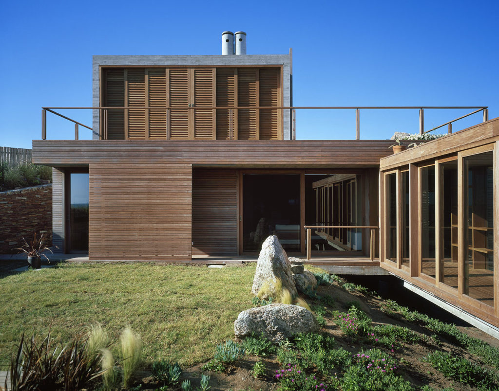 La materialidades hormigón visto y madera de Lapacho, pensando que desde la roca emerjan dos volúmenes que apoyados en patas y se integren al lugar como elementos tan radicales como el paisaje mismo.