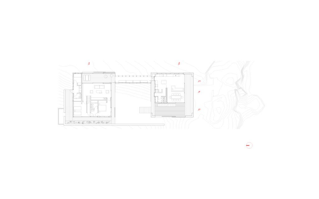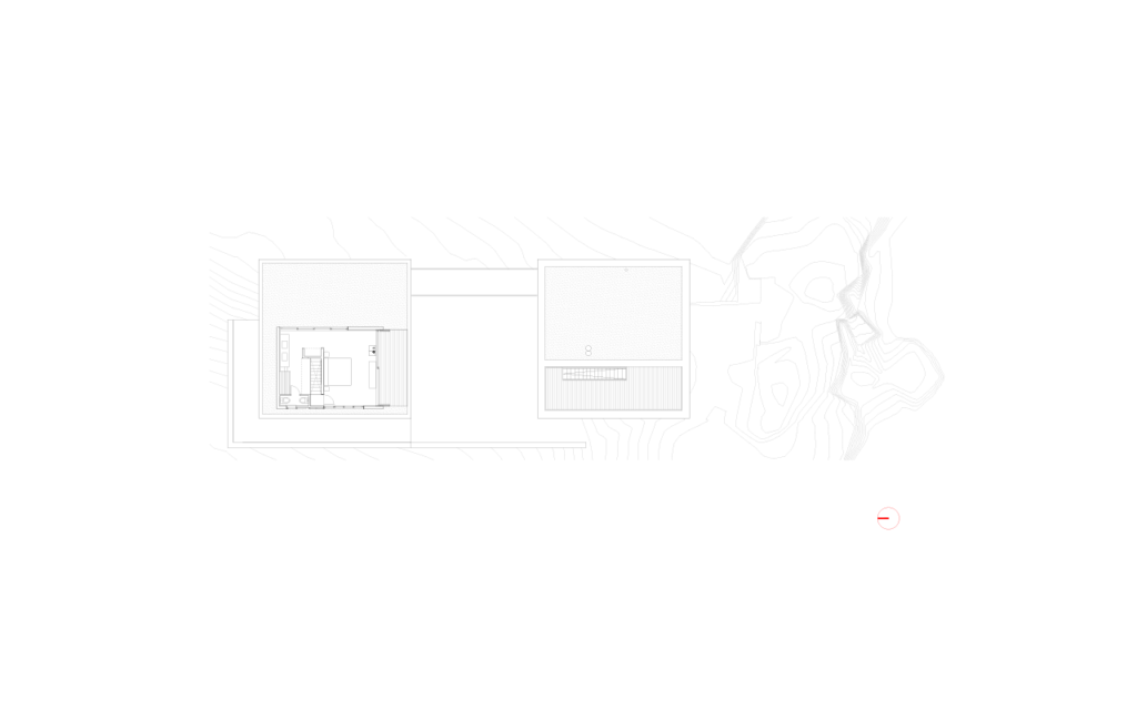 El programa, que debía contemplar un volumen principal para la vida social y otro para las habitaciones, fue resuelto en dos cajas a una misma altura, que generan dos patios en los vacíos que dejan estas cajas entre ellas, o bajo ellas.