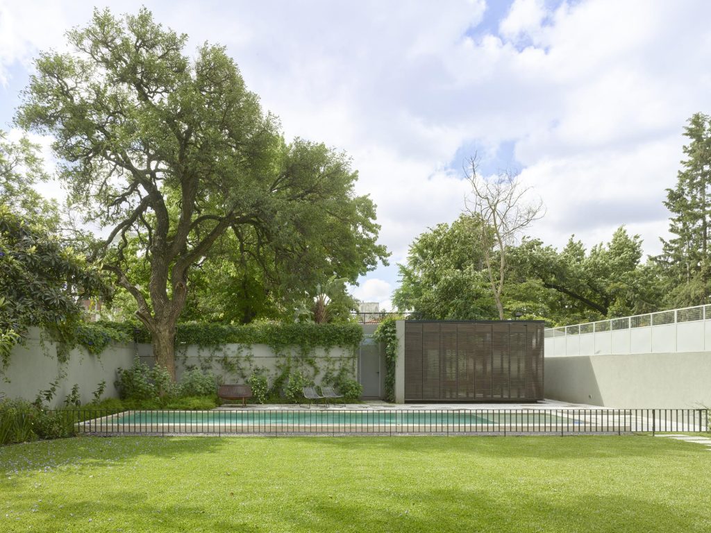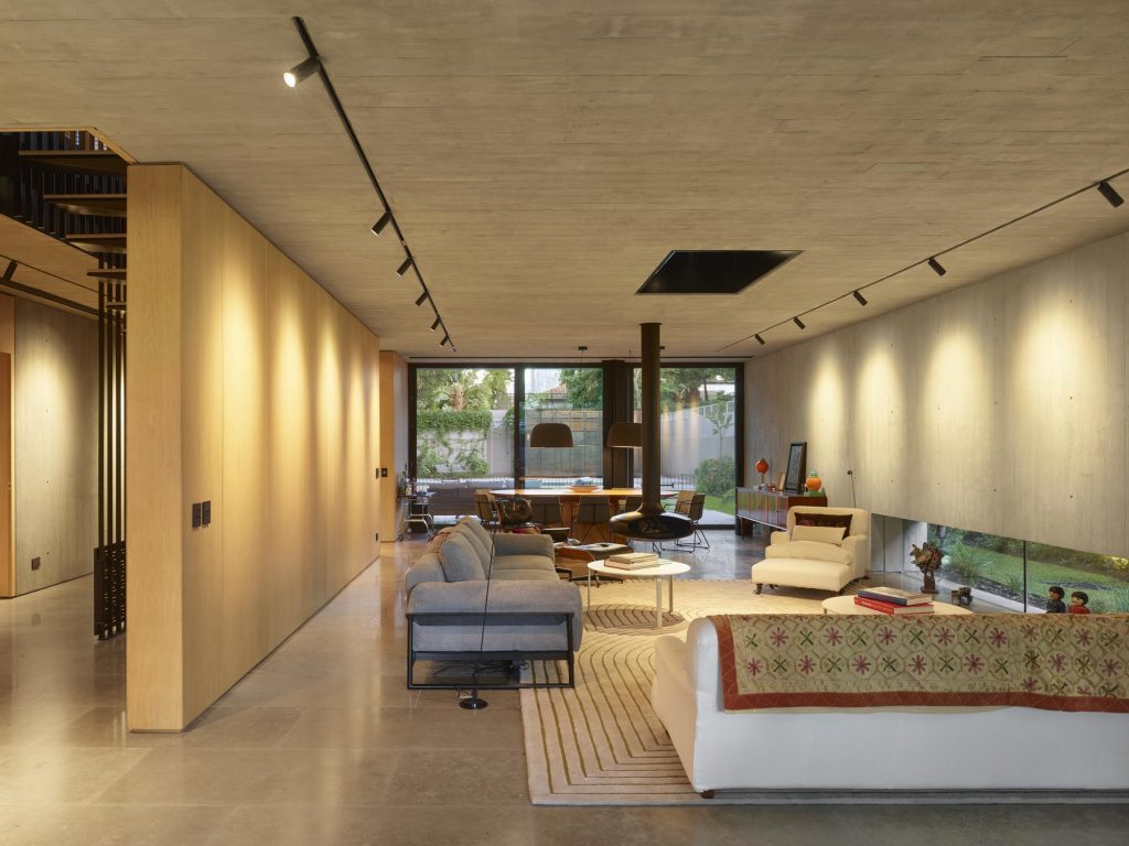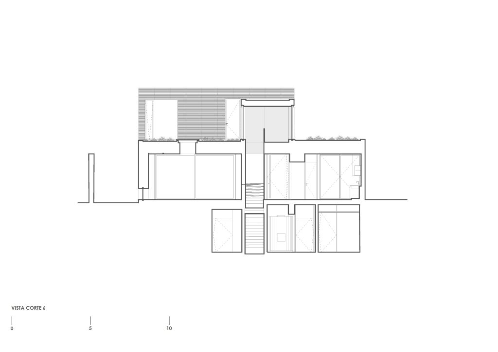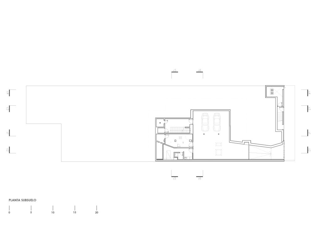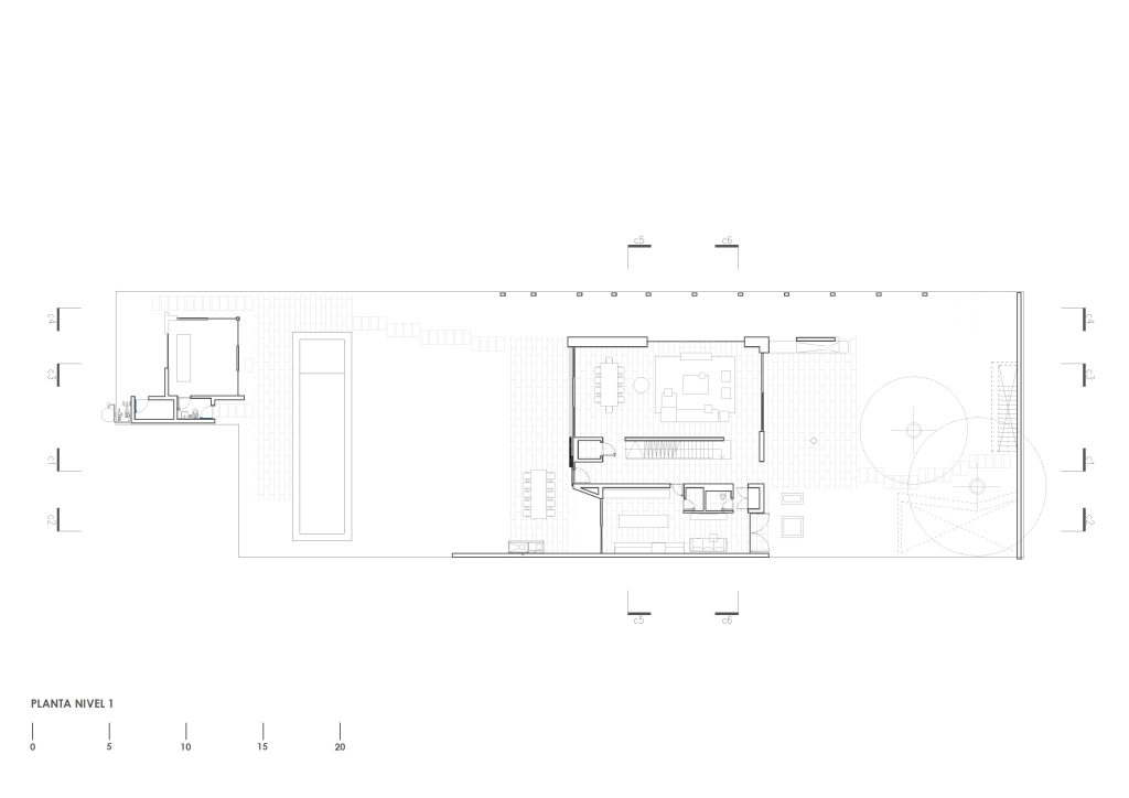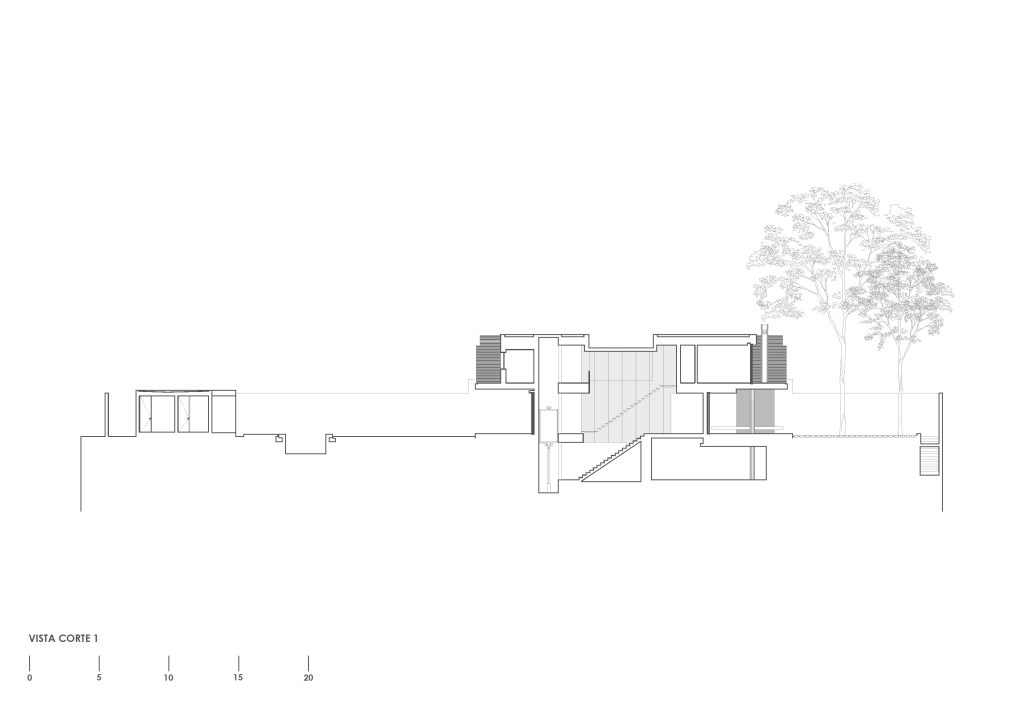 En planta baja ubicamos todo el programa público a lo largo de una secuencia de espacios sucesivos, flanqueados por dos pérgolas, que miran al jardín anterior y posterior respectivamente. El espacio común es continuo y se puede recorrer tanto física como visualmente en toda la longitud del lote.