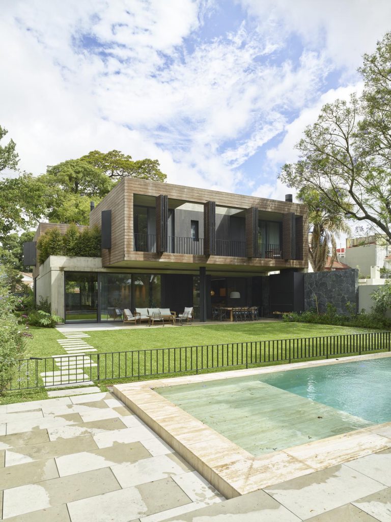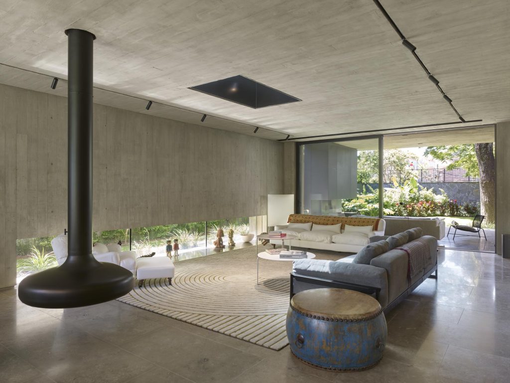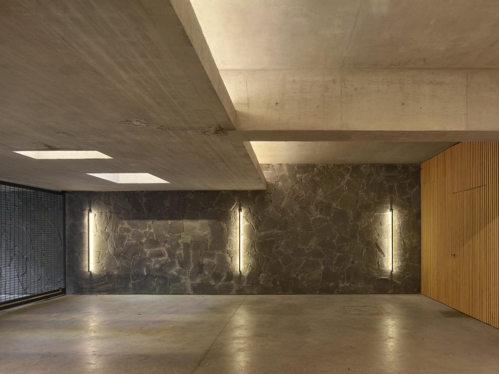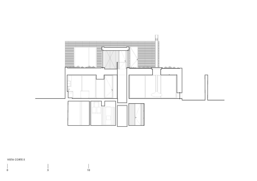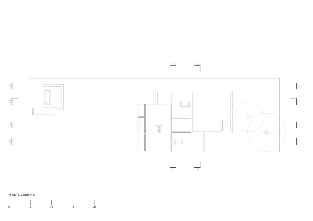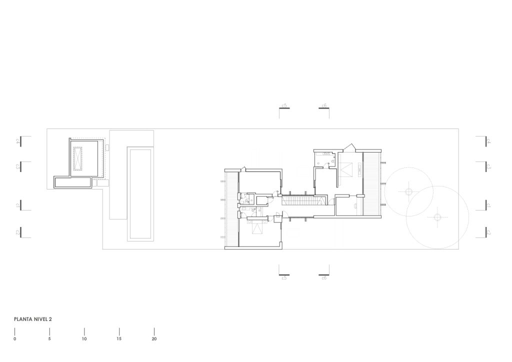En planta baja ubicamos todo el programa público a lo largo de una secuencia de espacios sucesivos, flanqueados por dos pérgolas, que miran al jardín anterior y posterior respectivamente. El espacio común es continuo y se puede recorrer tanto física como visualmente en toda la longitud del lote.