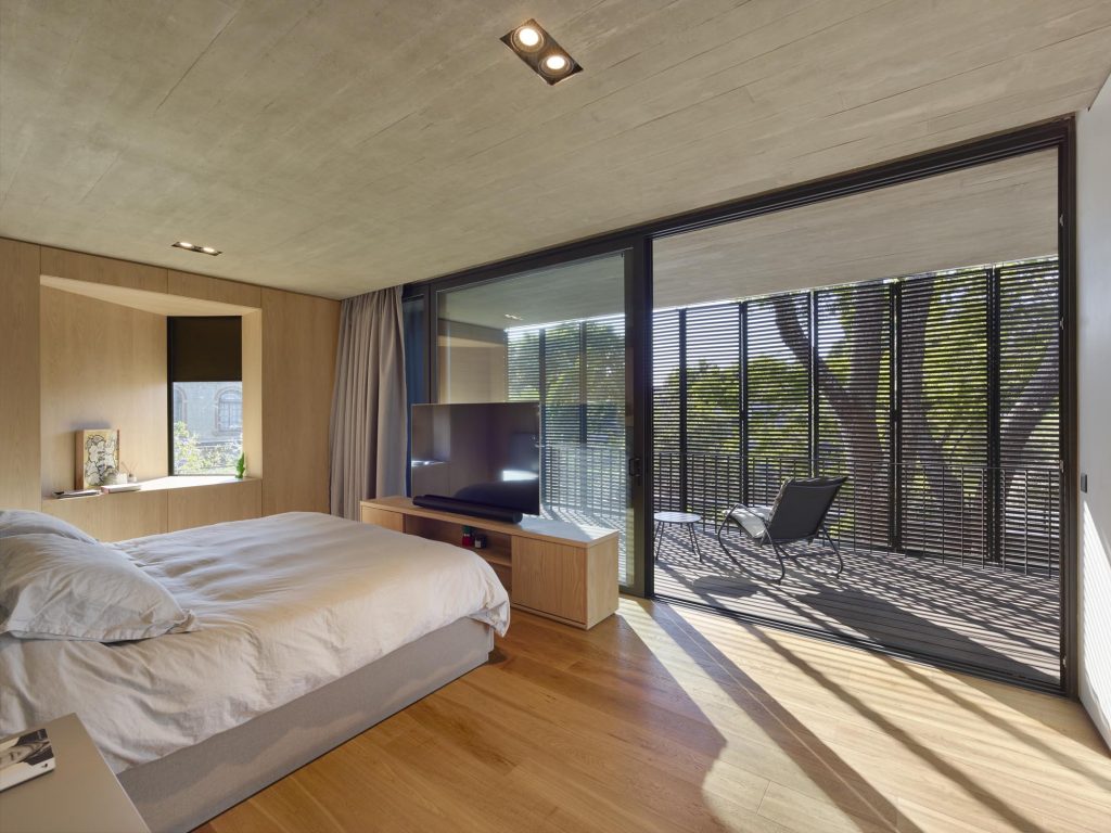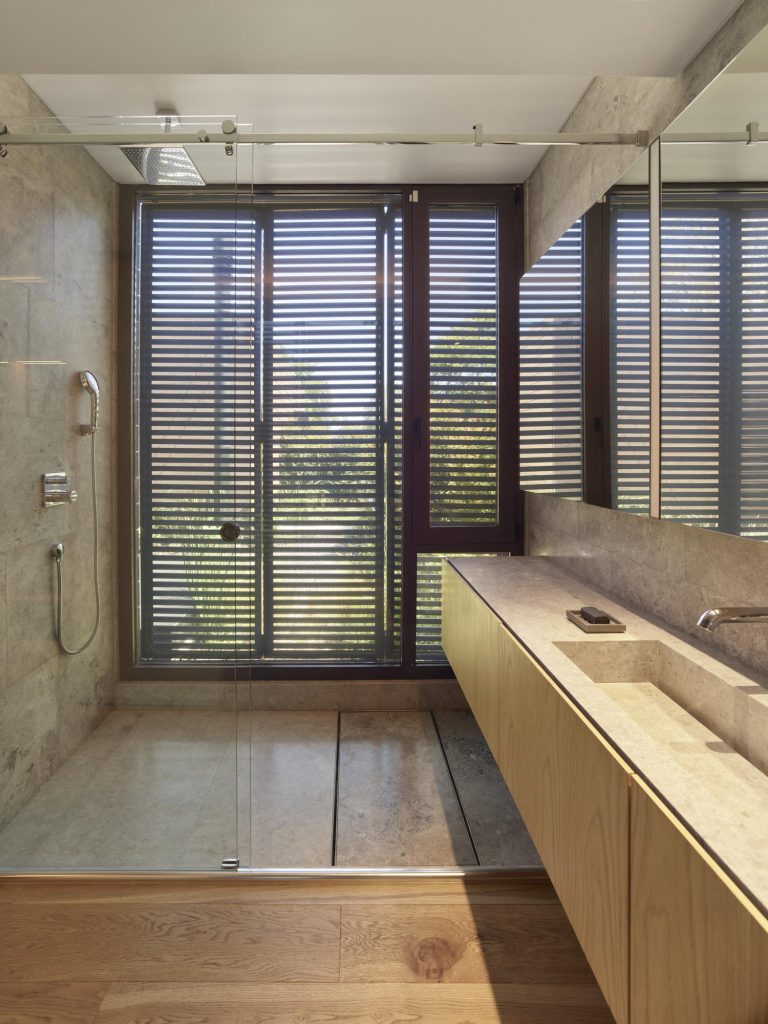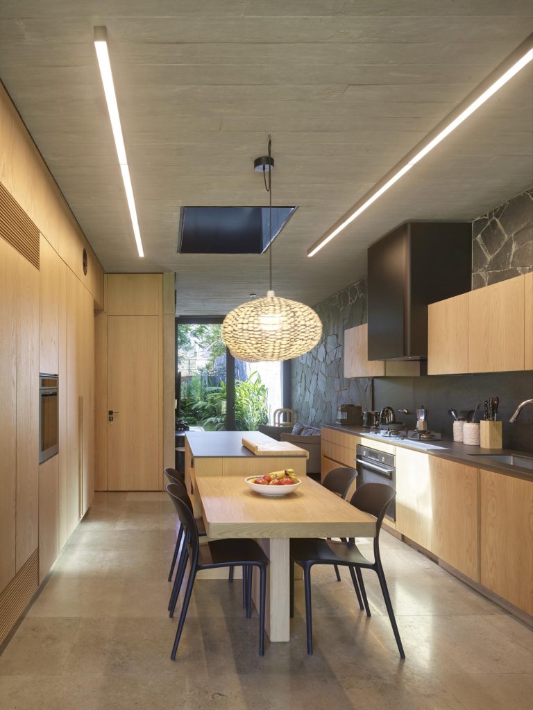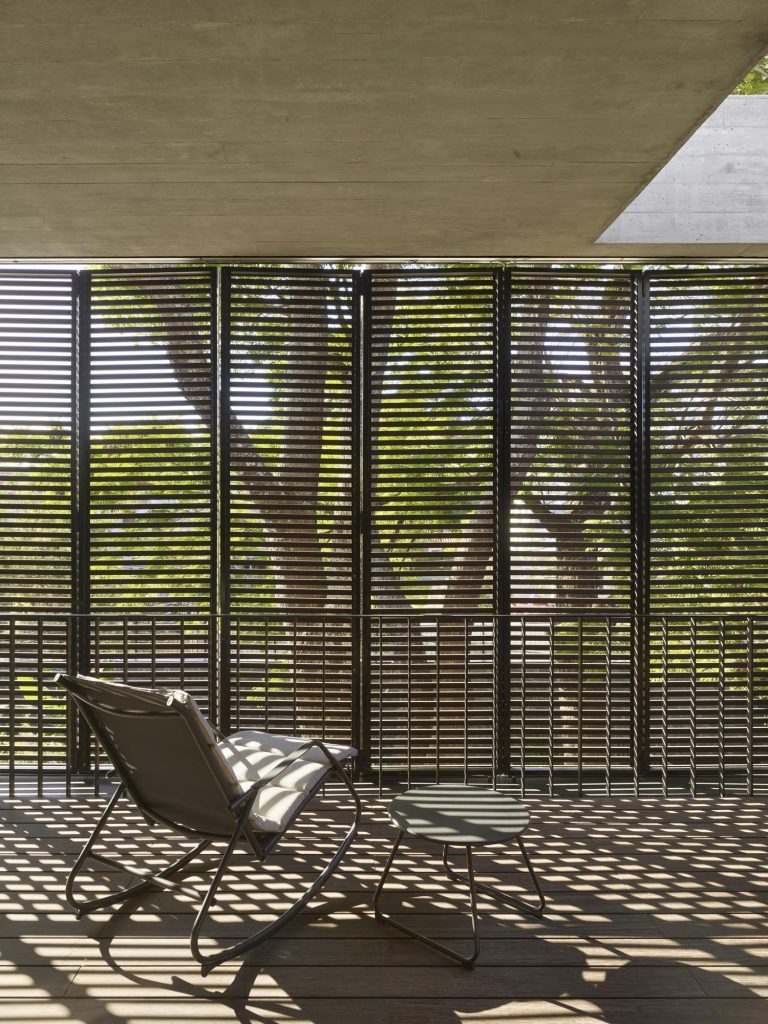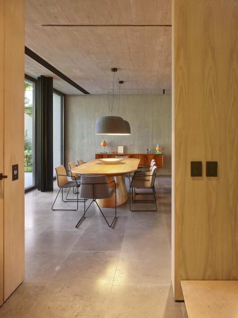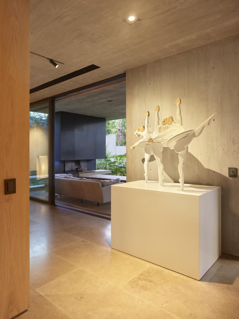 En planta baja ubicamos todo el programa público a lo largo de una secuencia de espacios sucesivos, flanqueados por dos pérgolas, que miran al jardín anterior y posterior respectivamente. El espacio común es continuo y se puede recorrer tanto física como visualmente en toda la longitud del lote.