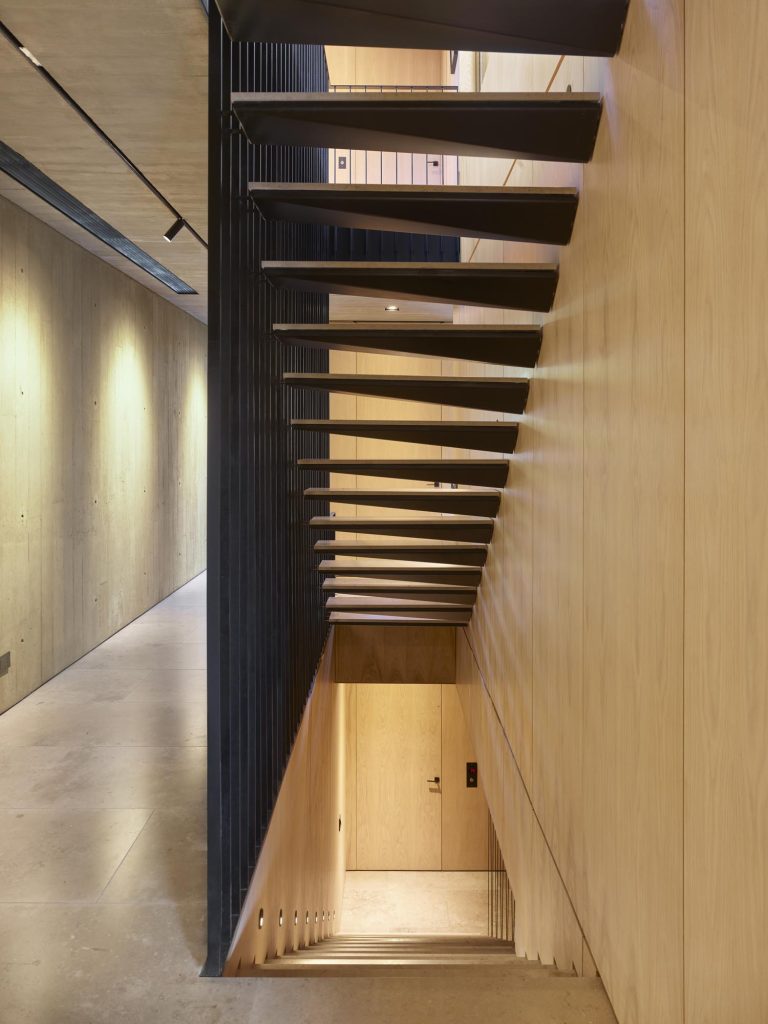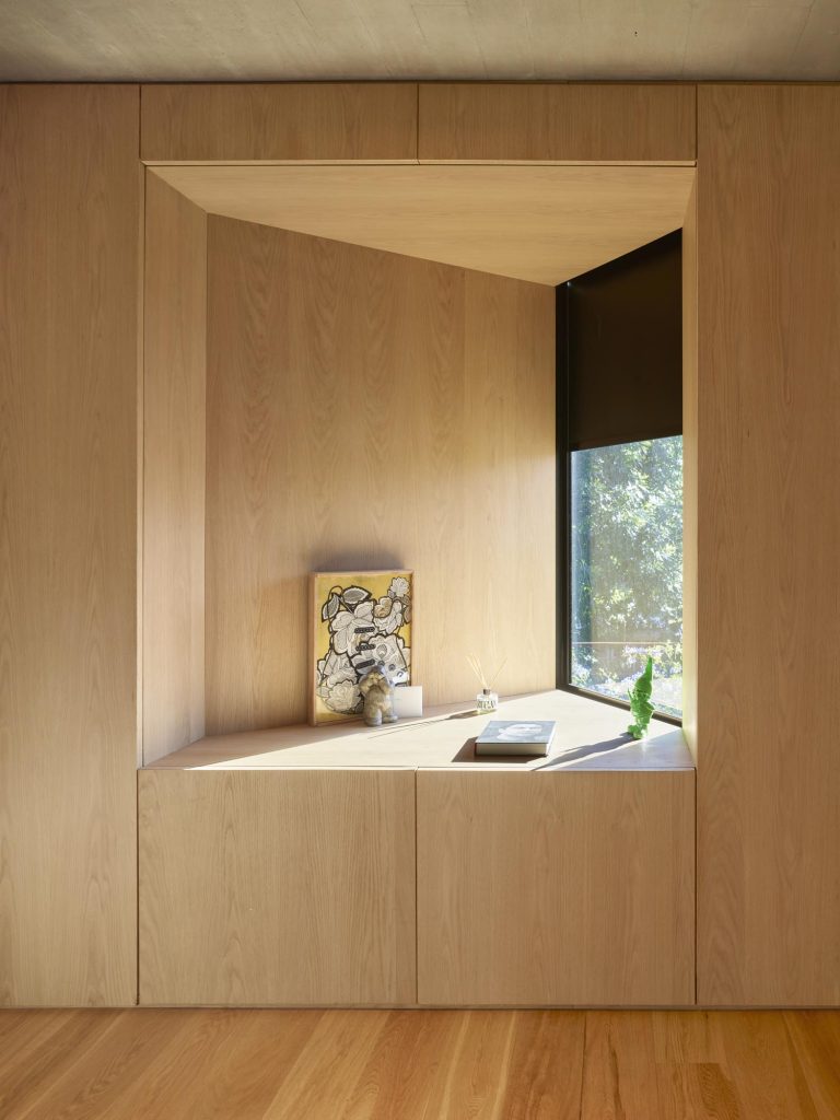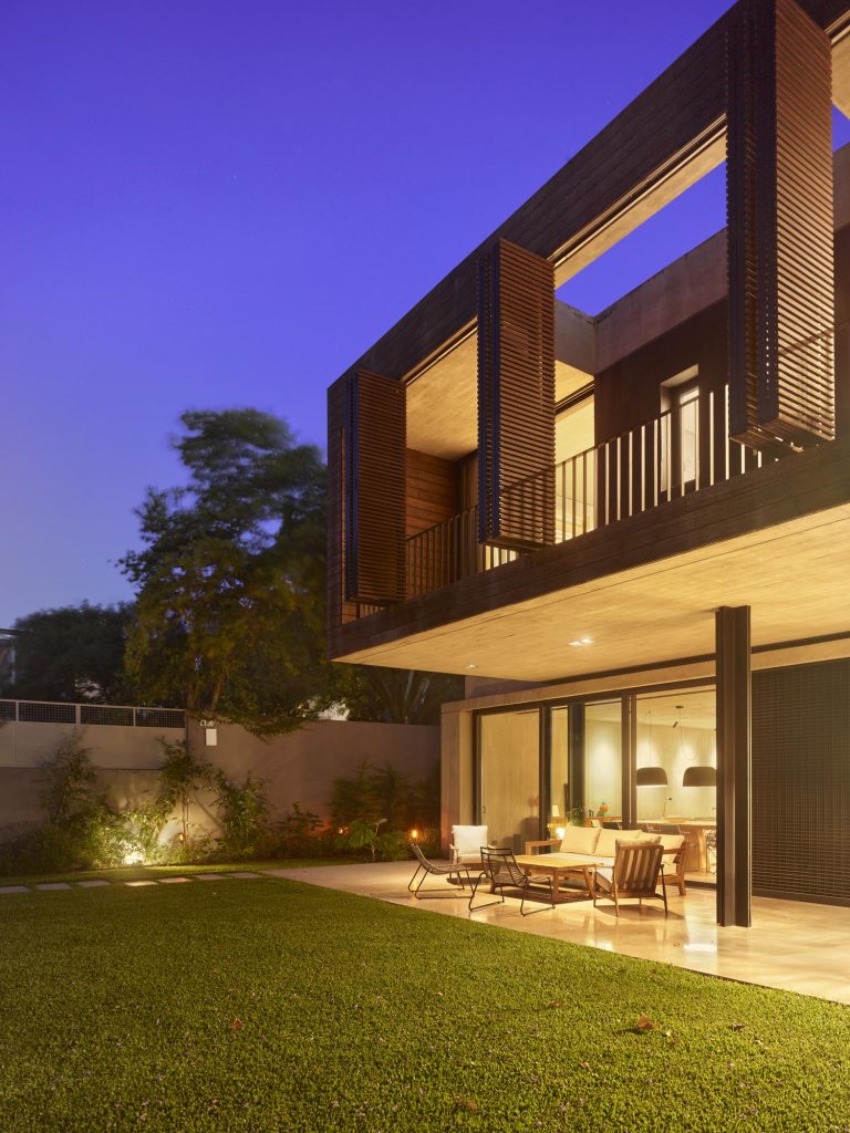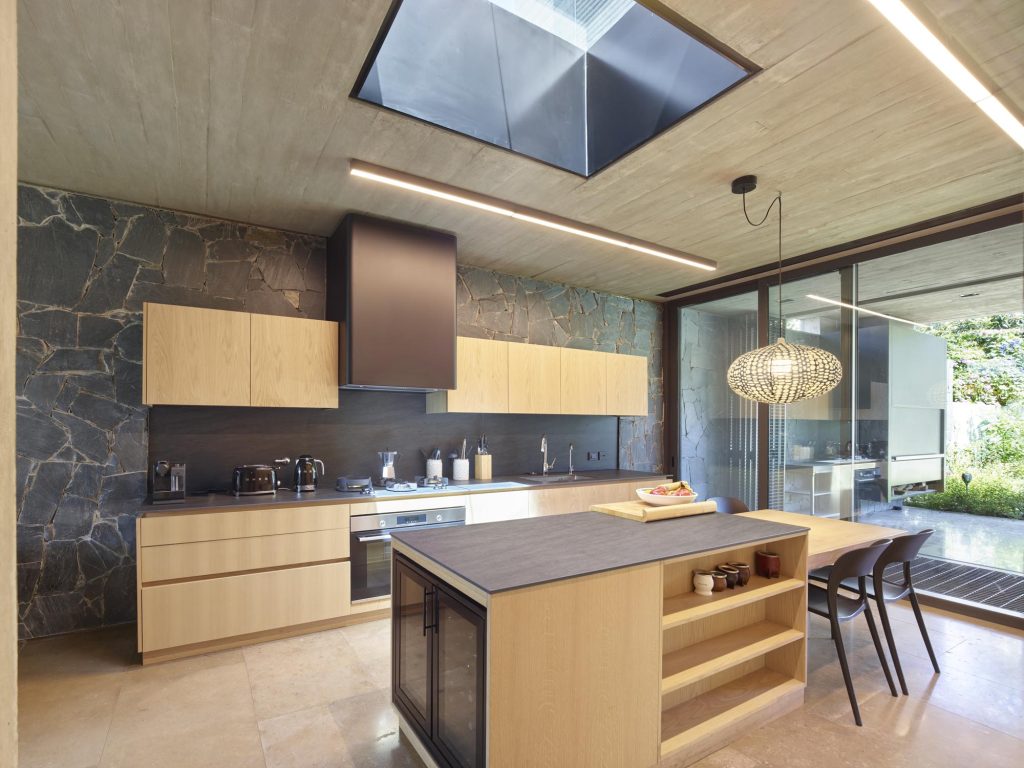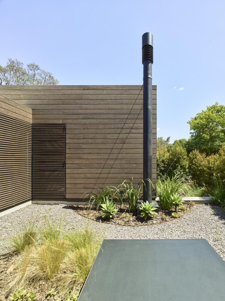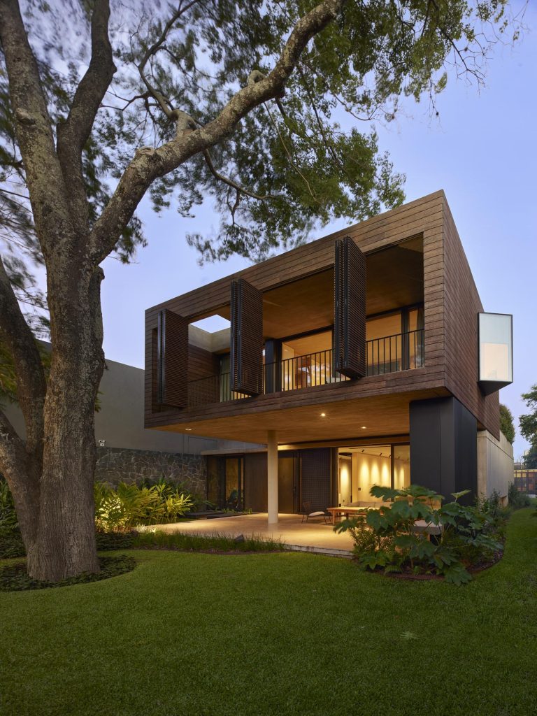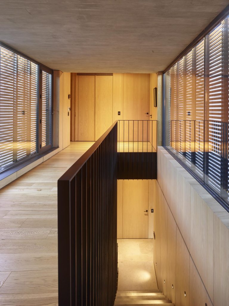 La casa está concebida materialmente como unos volúmenes de madera sobre una base de hormigón y cristal.