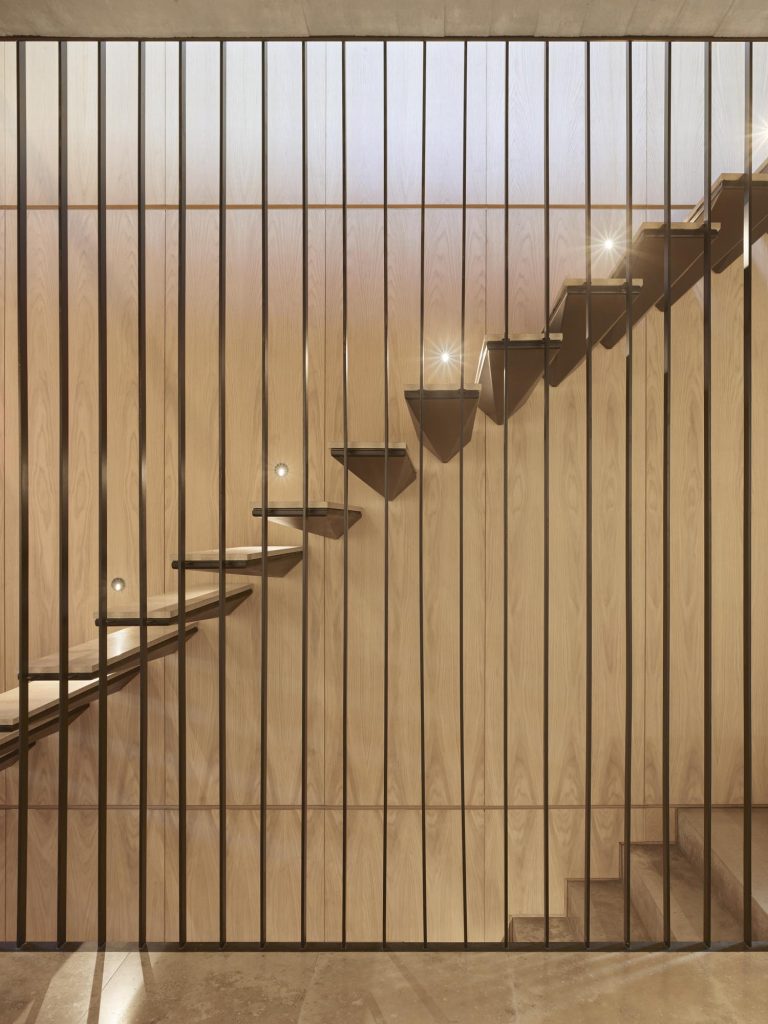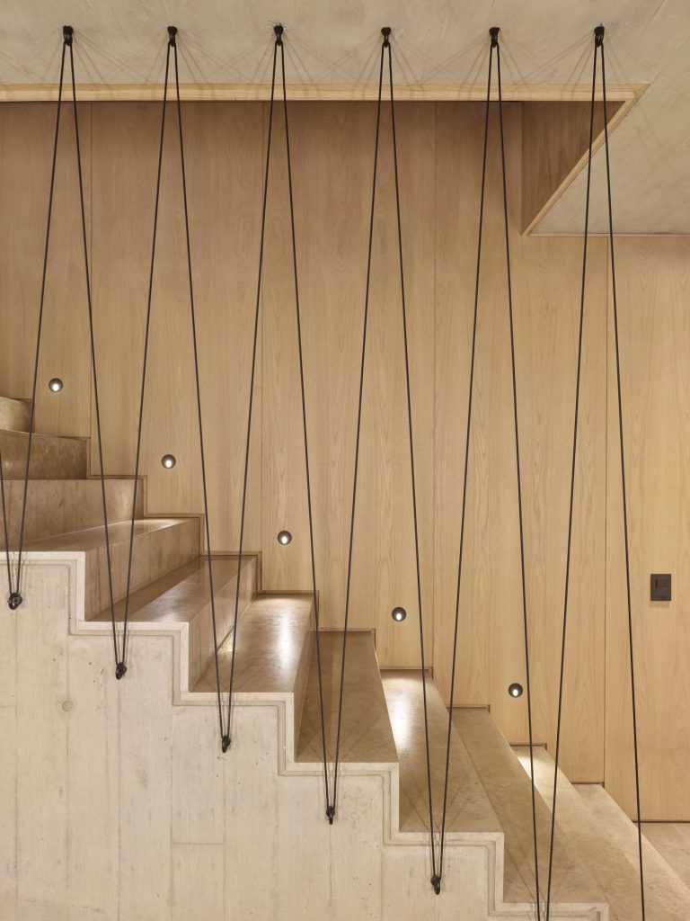 Los materiales empleados son madera, piedra, hormigón y cristal.