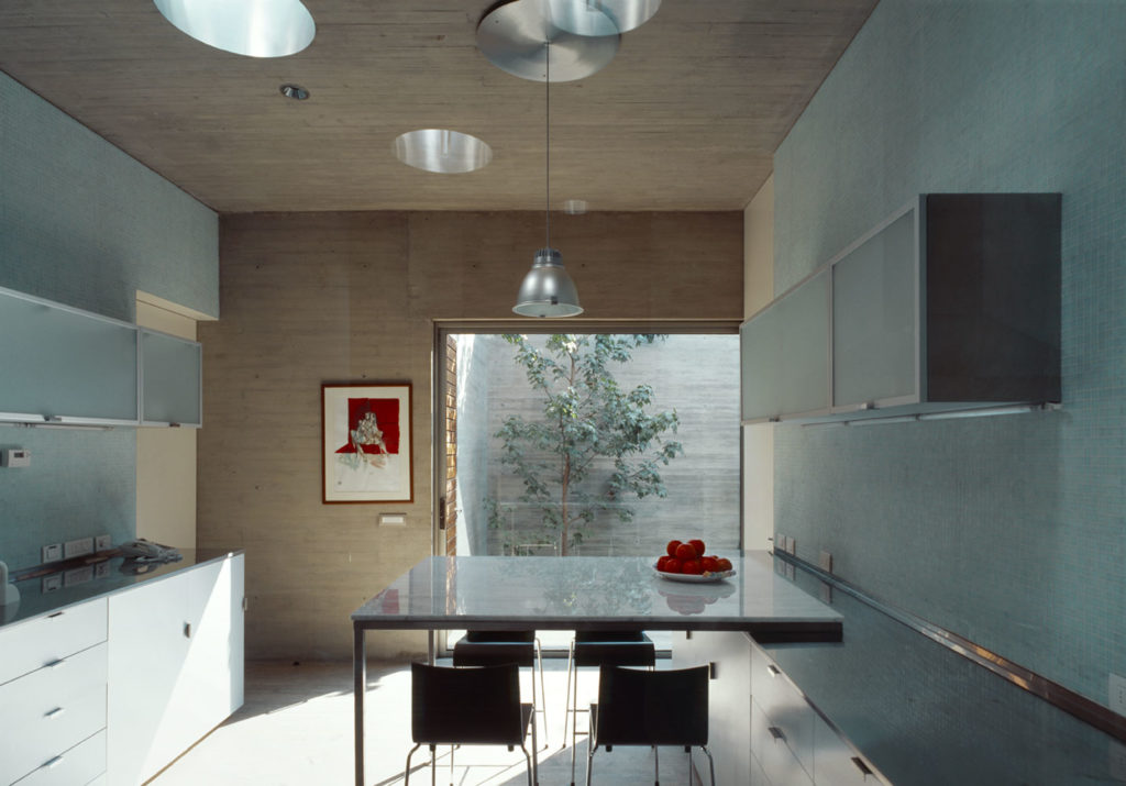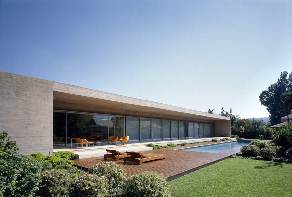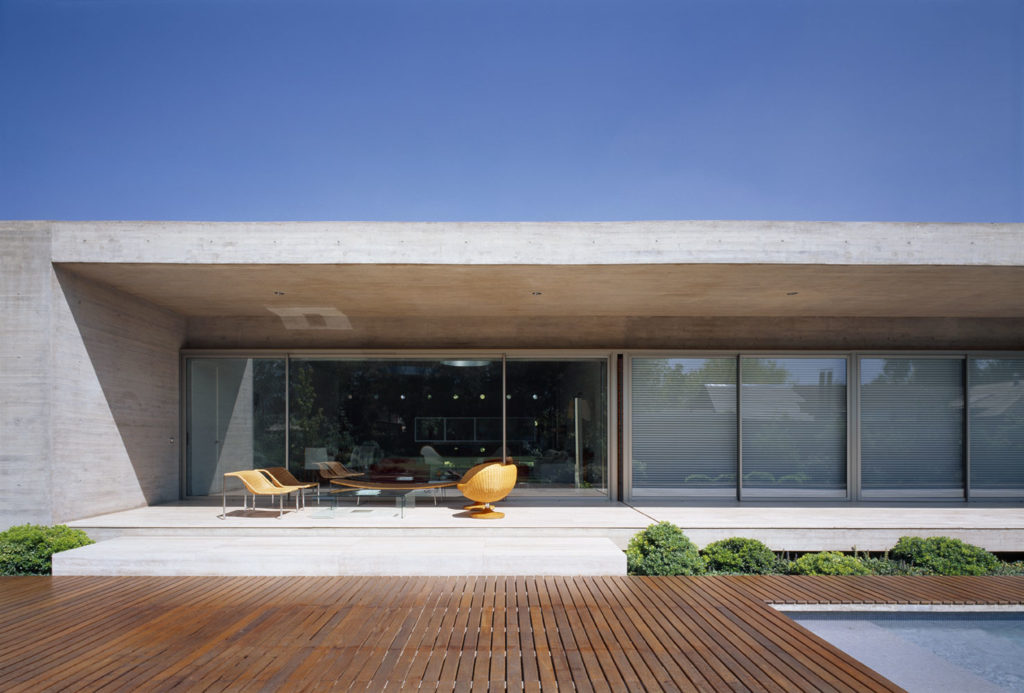 La casa es un rectángulo de 12 x 40 m, que se emplaza en el fondo del terreno, liberando un amplio frente. En un nivel, construido íntegramente en hormigón armado.