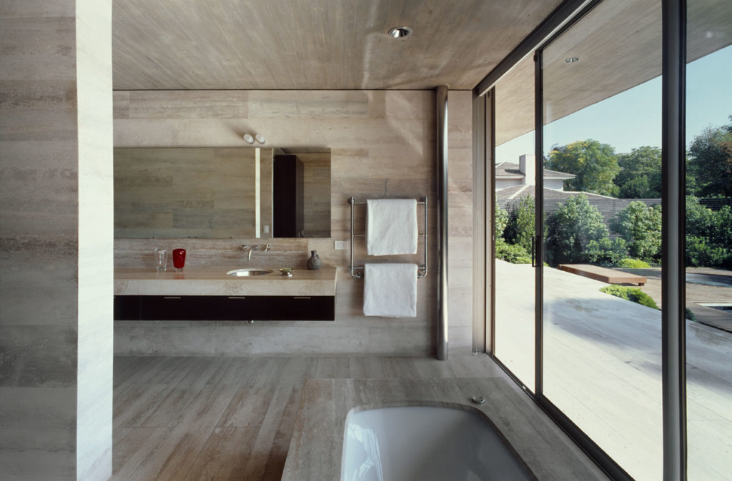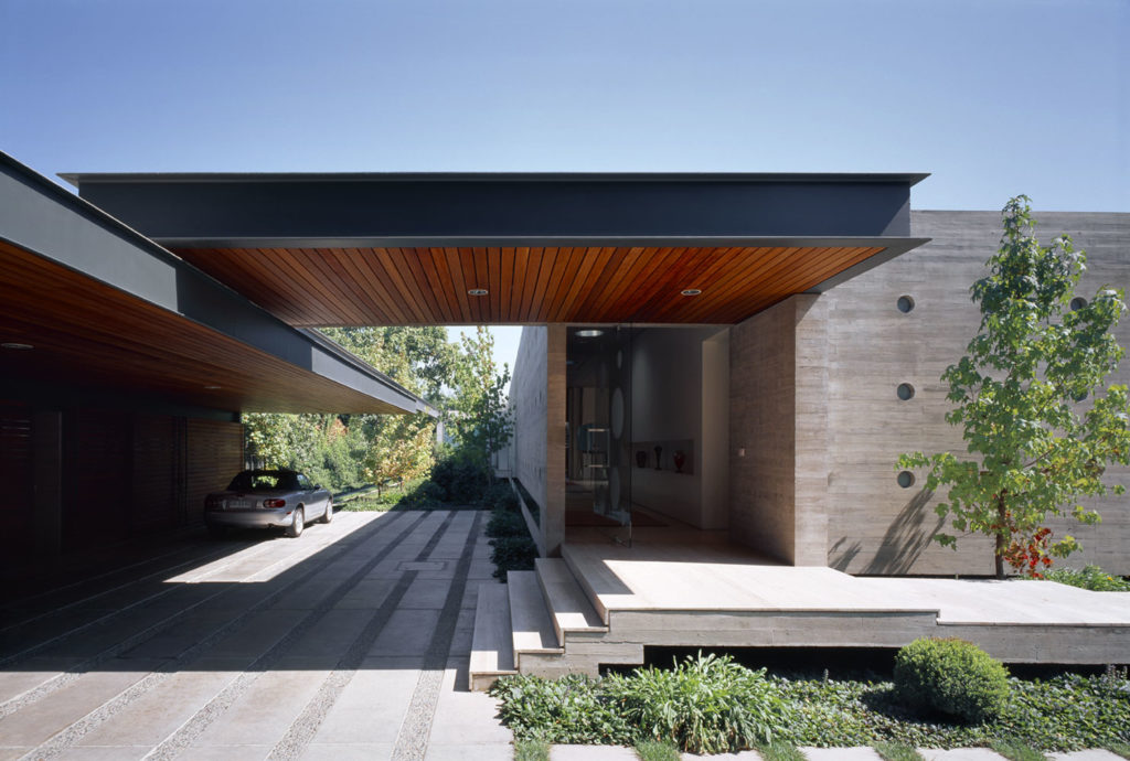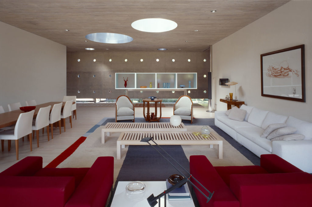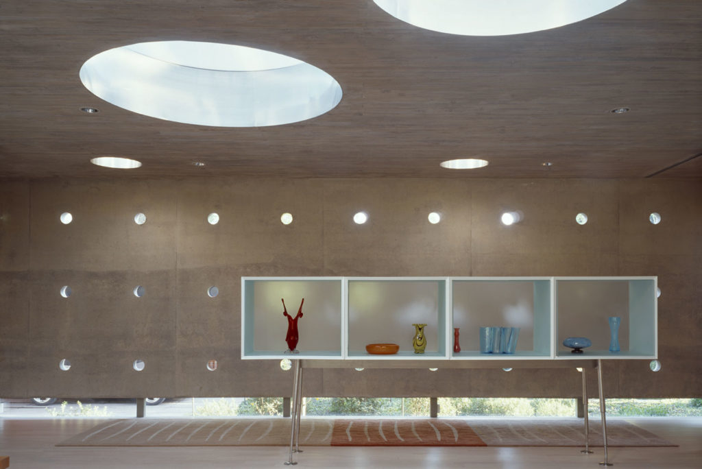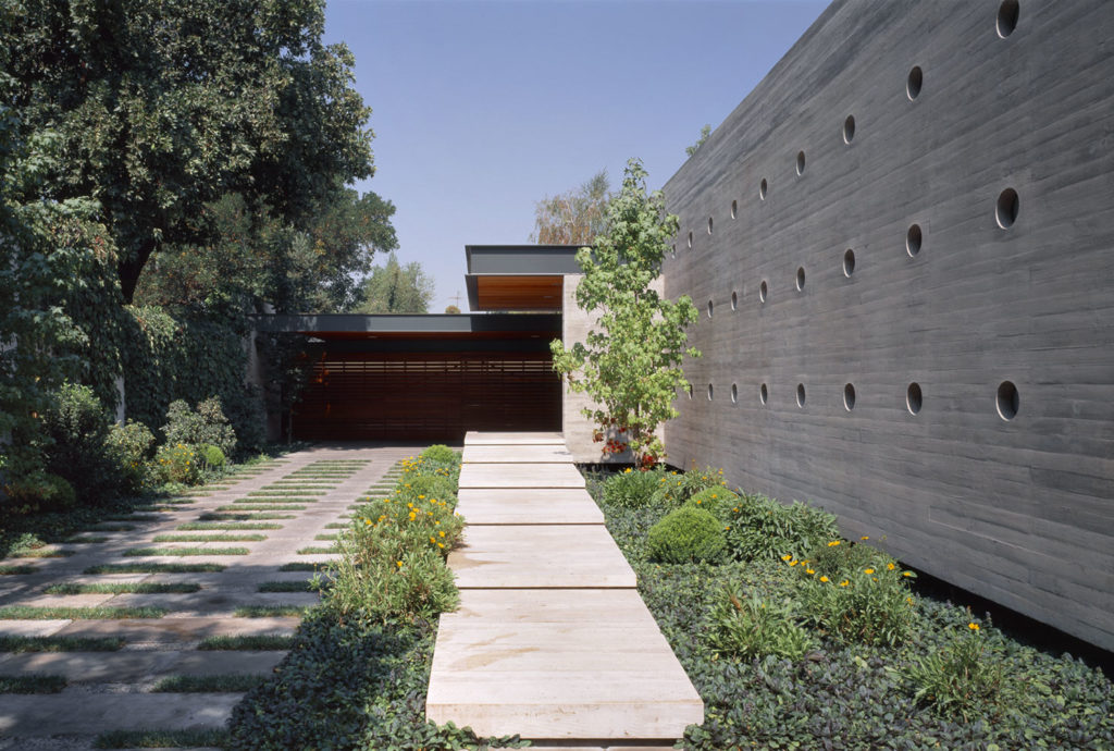 El hormigón es dejado visto en el perímetro, y se trabaja con distintas texturas, provocado contrastes entre sus superficies.