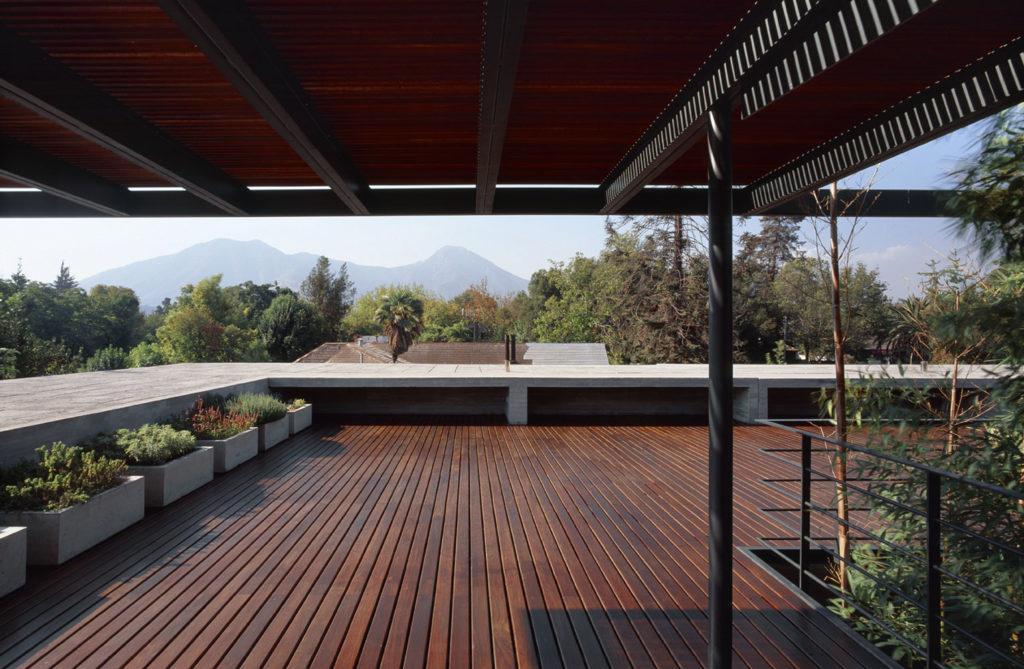 La cubierta de la casa ha sido transformada en terraza, aprovechando estos cambios de nivel de las losas y ganando vistas en 360 grados de los cerros que rodean la ciudad de Santiago.