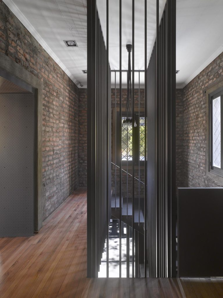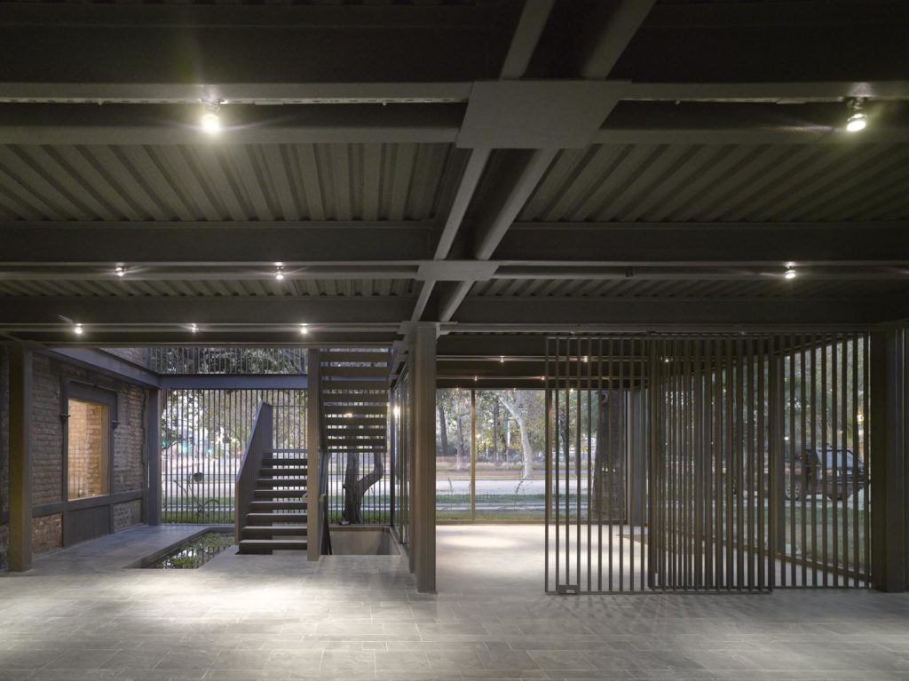 The two rooms of the original structure were restored, removing the stucco and leaving the brickwork visible, with the exception of the cornices. These were painted the same dark gray as the steel structure of the new volume, in order to link the two structures together and emphasize the original building.