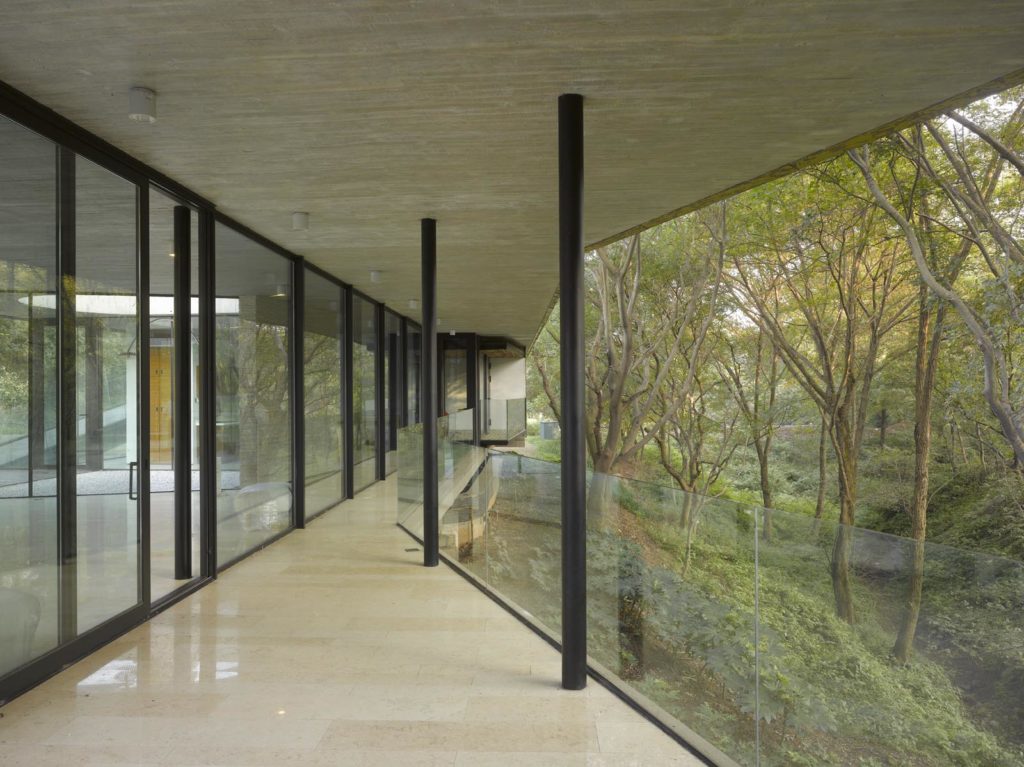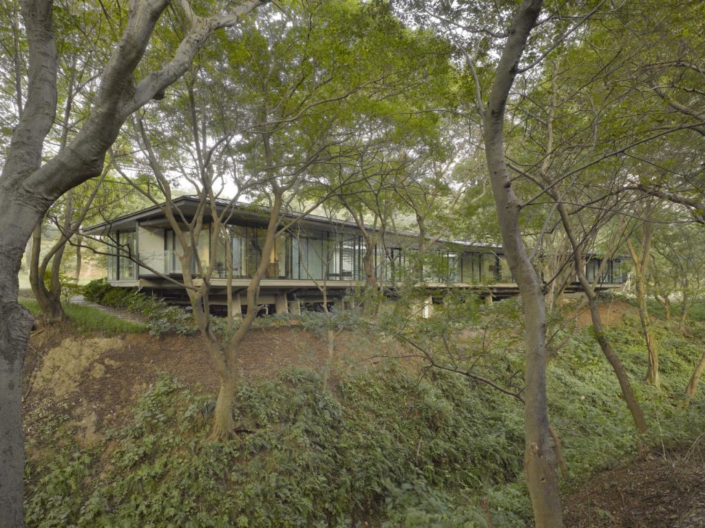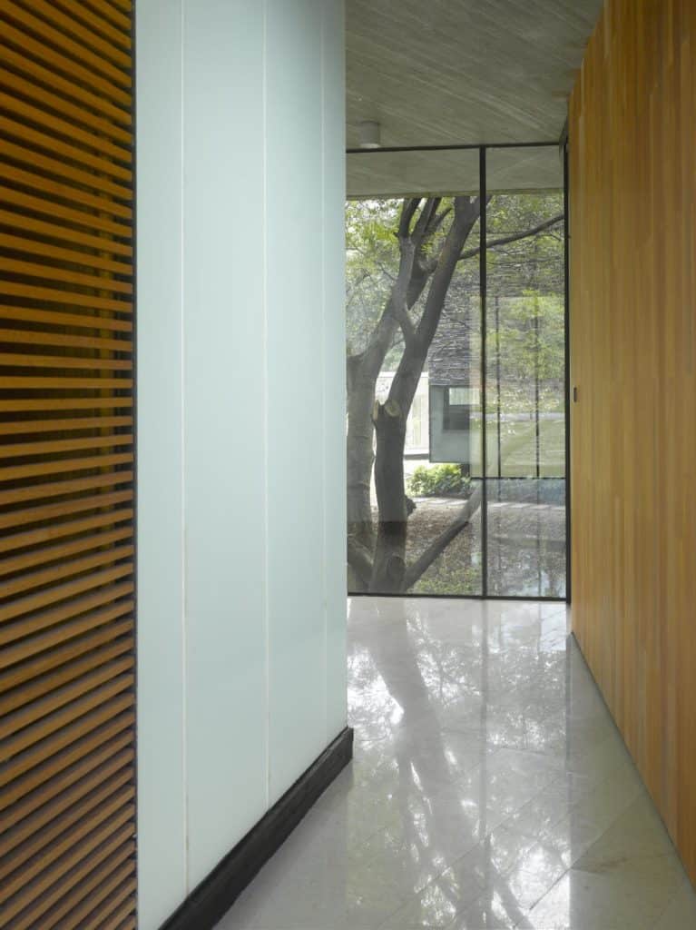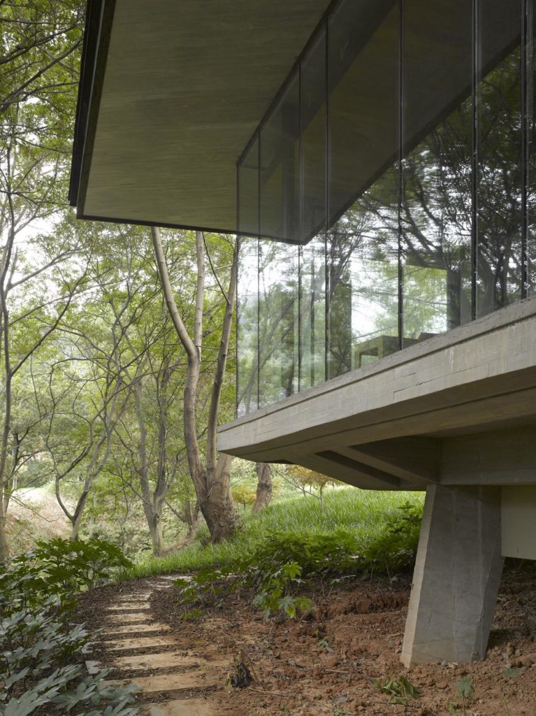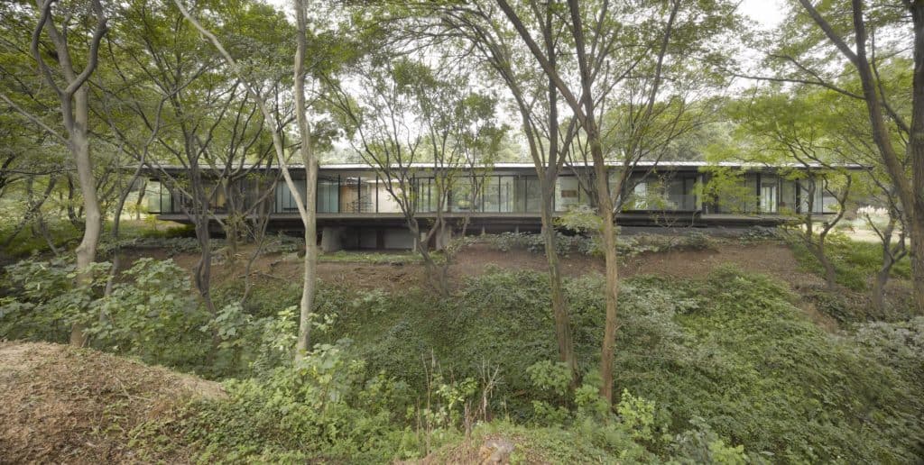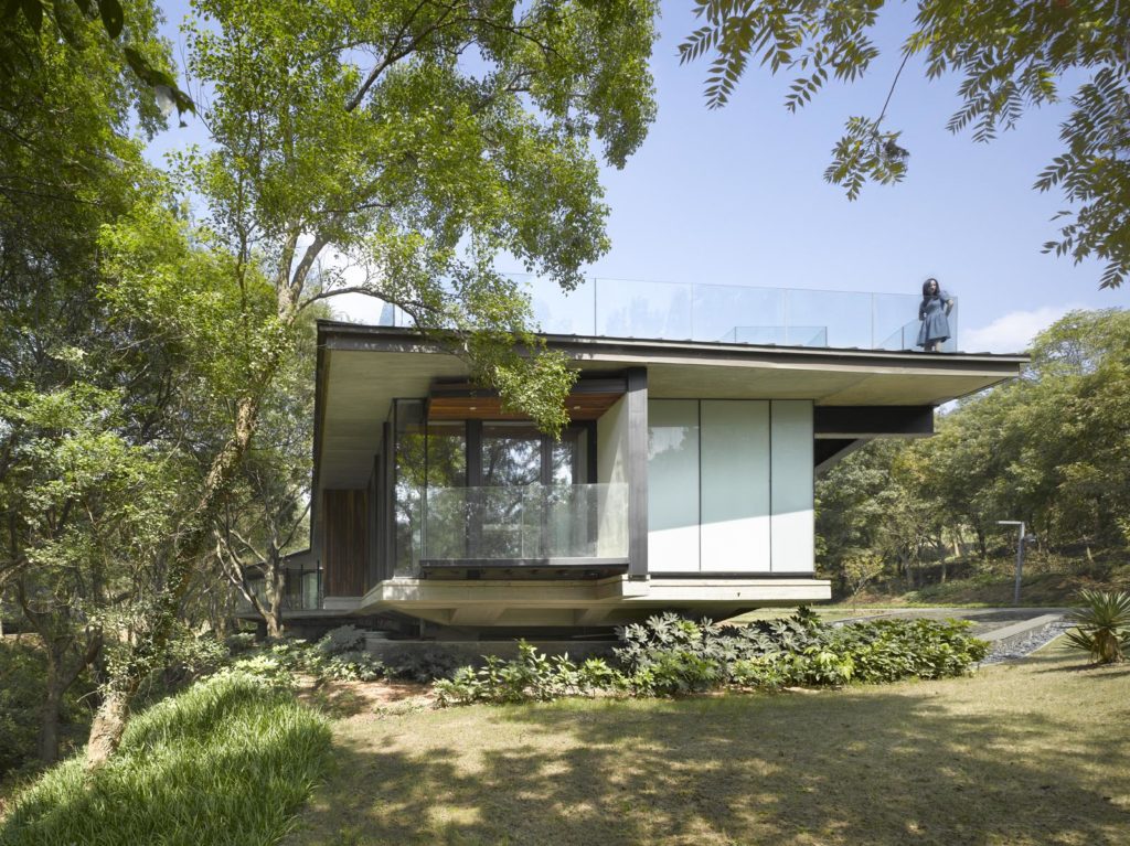 The project is resolved on three levels. In the First, characterized by structural supports, the parking lots and a machine room are located. These supports raise the main floor to the height of the treetops; in it there are five rooms like closed wooden boxes, which, like independent cubicles, articulate the corridors and the different social areas, orienting views of the land and the trees during the project’s route. The floor is made of travertine marble and the ceiling is made of exposed concrete. The bathrooms associated with the bedrooms are volumes of translucent glass, illuminated by reflections coming from skylights on the flooded roof of the third level. This is proposed as a 30-centimeter-deep pond, with a garden of aquatic plants and a route that incorporates stopping points from which it is possible to observe the distant landscape.