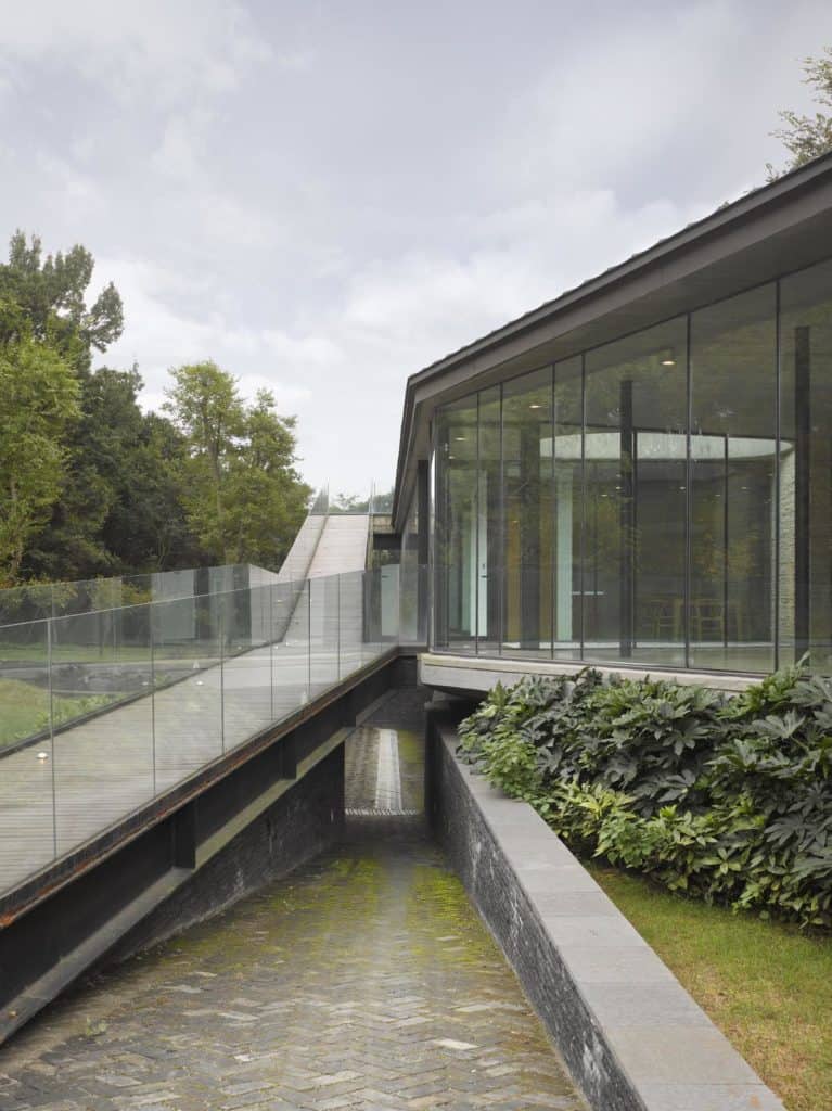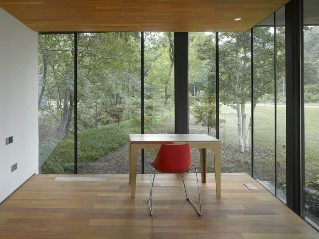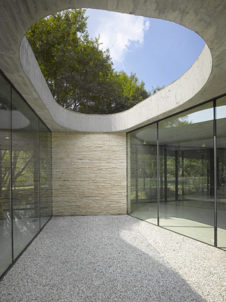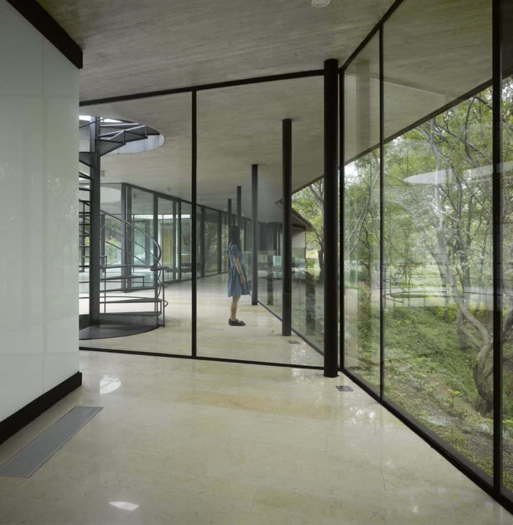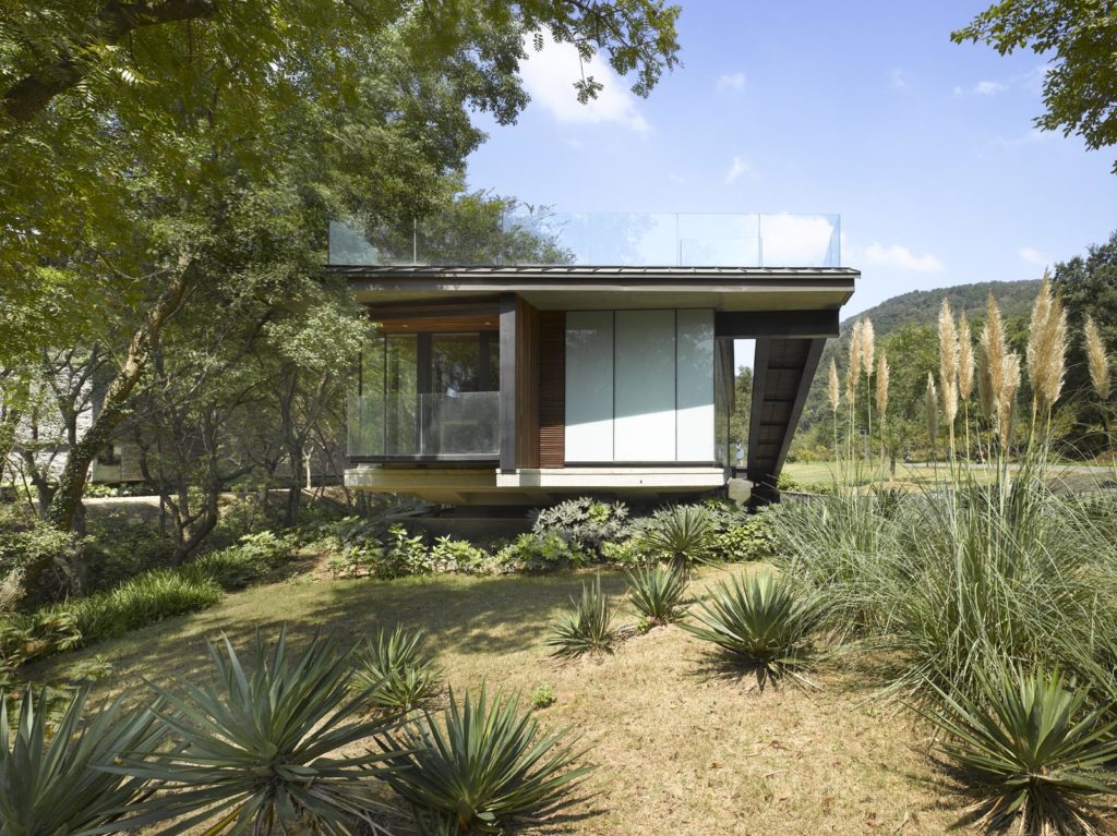 The project is resolved on three levels. In the First, characterized by structural supports, the parking lots and a machine room are located. These supports raise the main floor to the height of the treetops; in it there are five rooms like closed wooden boxes, which, like independent cubicles, articulate the corridors and the different social areas, orienting views of the land and the trees during the project’s route. The floor is made of travertine marble and the ceiling is made of exposed concrete. The bathrooms associated with the bedrooms are volumes of translucent glass, illuminated by reflections coming from skylights on the flooded roof of the third level. This is proposed as a 30-centimeter-deep pond, with a garden of aquatic plants and a route that incorporates stopping points from which it is possible to observe the distant landscape.