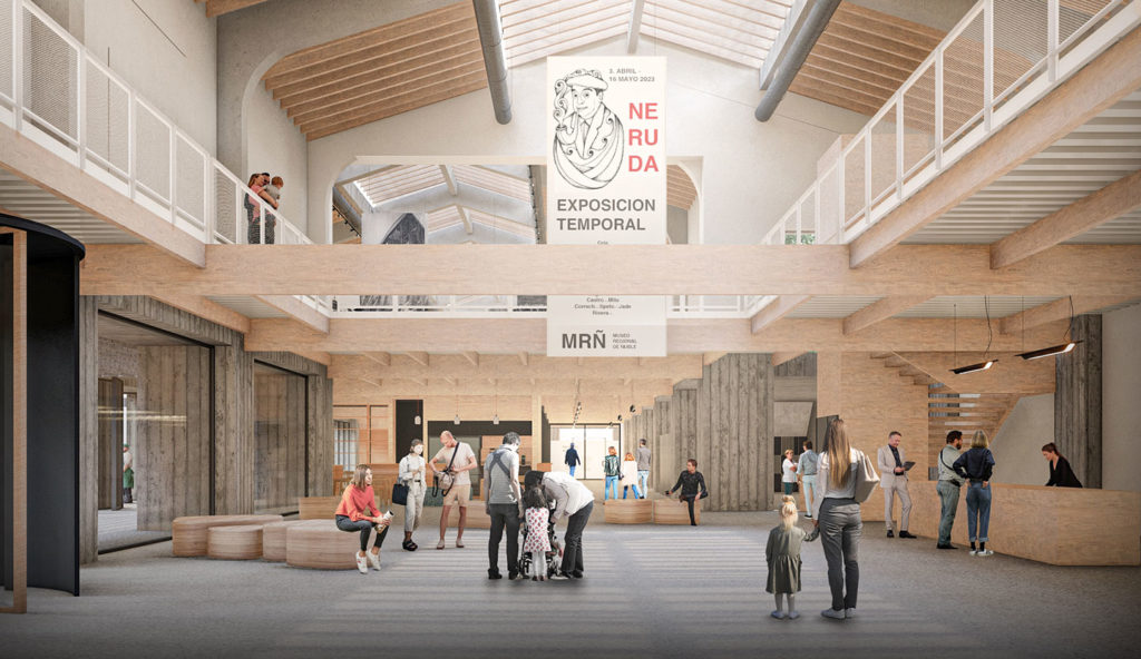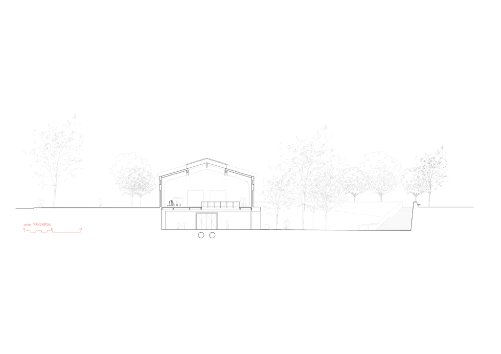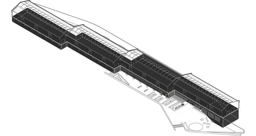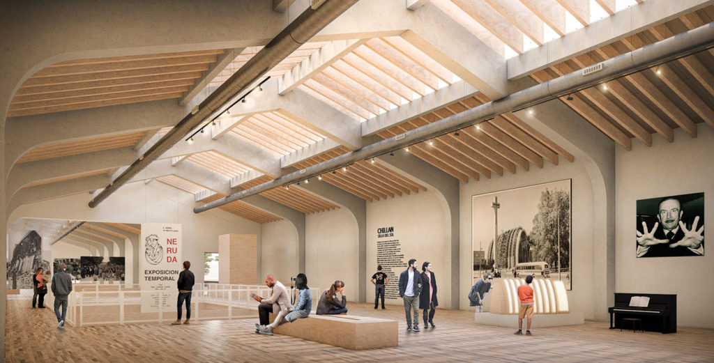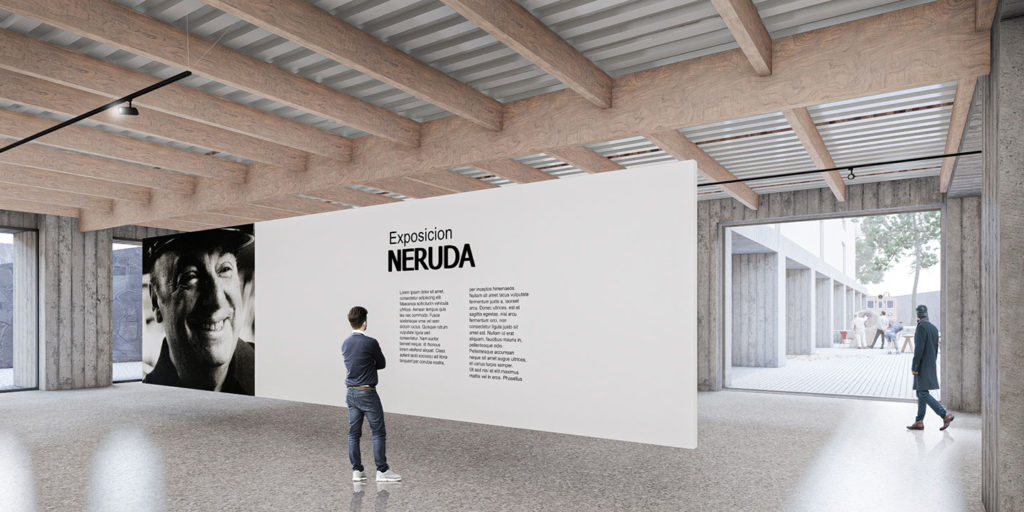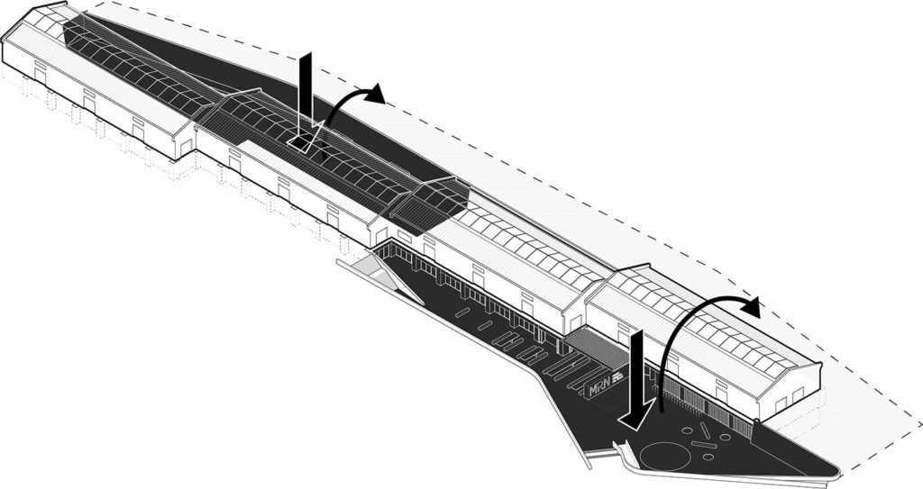 En los muros de los galpones, cerramos los vanos existentes para favorecer la condición de exhibición y recorrido interior e iluminación requeridas por un espacio expositivo, dejando intencionadamente en el exterior un bajo relieve que da testimonio de su preexistencia, manteniendo el grano del edificio.