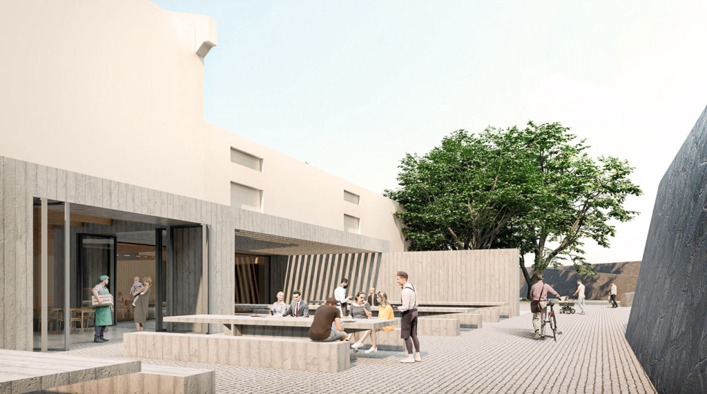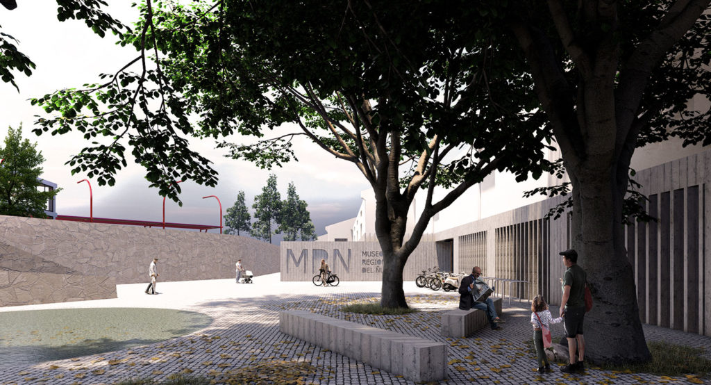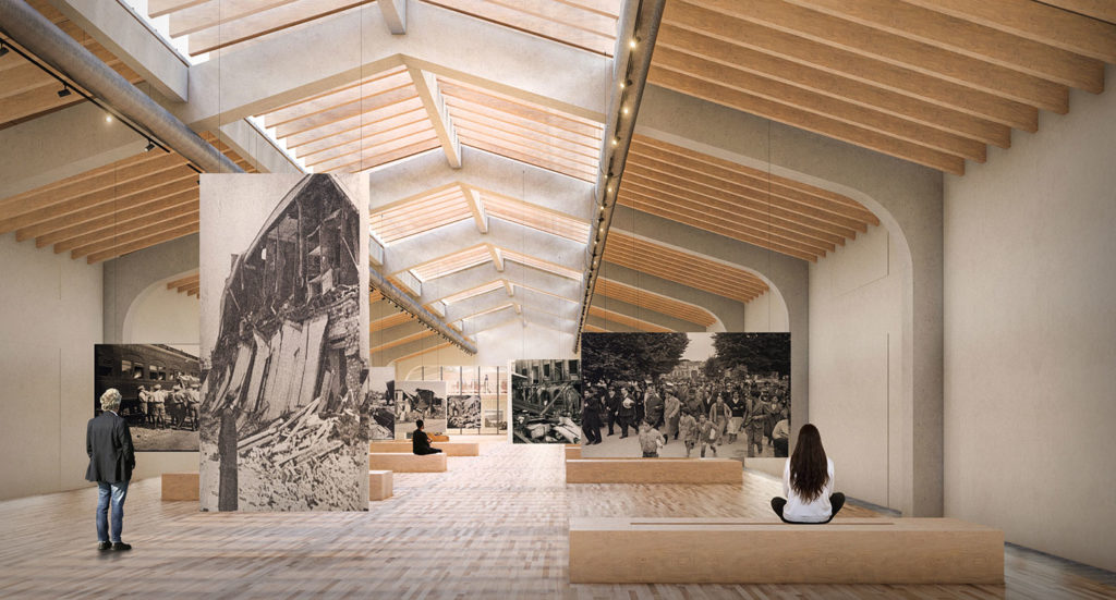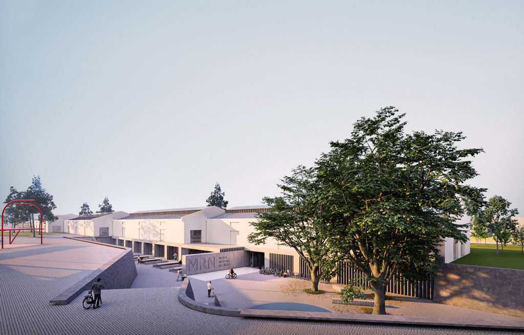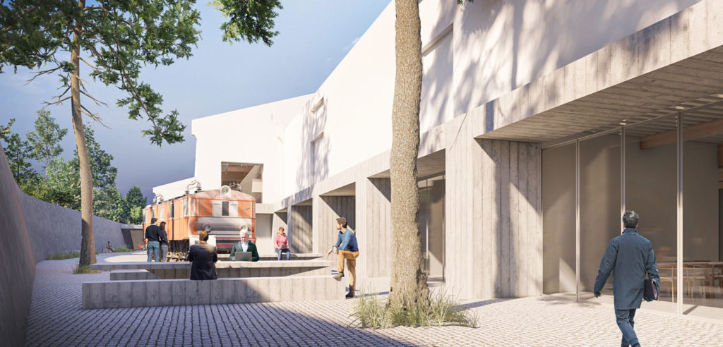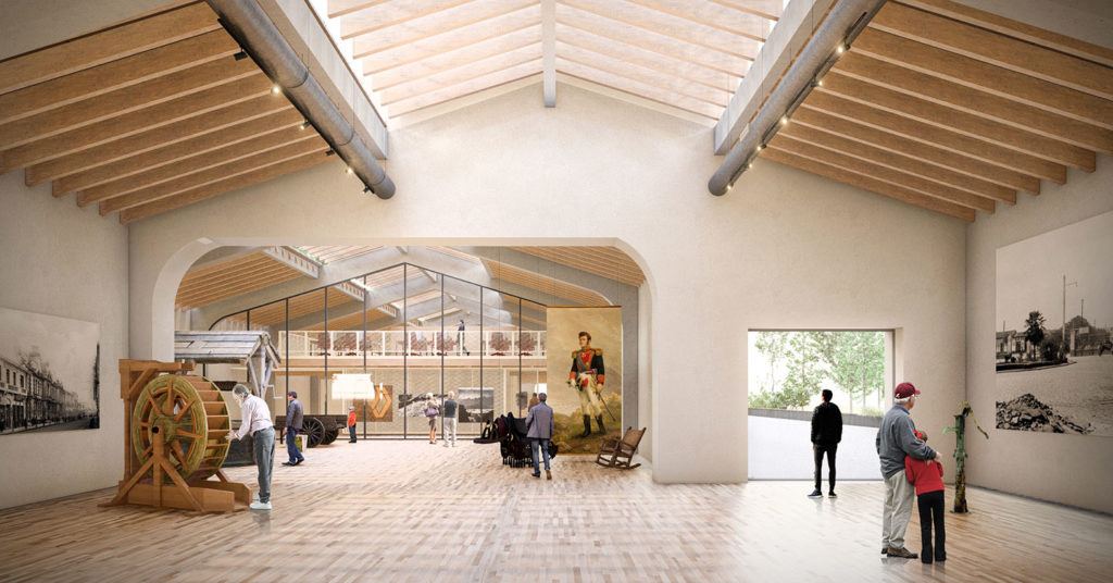 En los muros de los galpones, cerramos los vanos existentes para favorecer la condición de exhibición y recorrido interior e iluminación requeridas por un espacio expositivo, dejando intencionadamente en el exterior un bajo relieve que da testimonio de su preexistencia, manteniendo el grano del edificio.