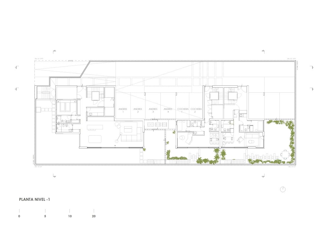 The garage, located in the basement, is an open and continuous space, from which the two volumes that organize the space emerge.