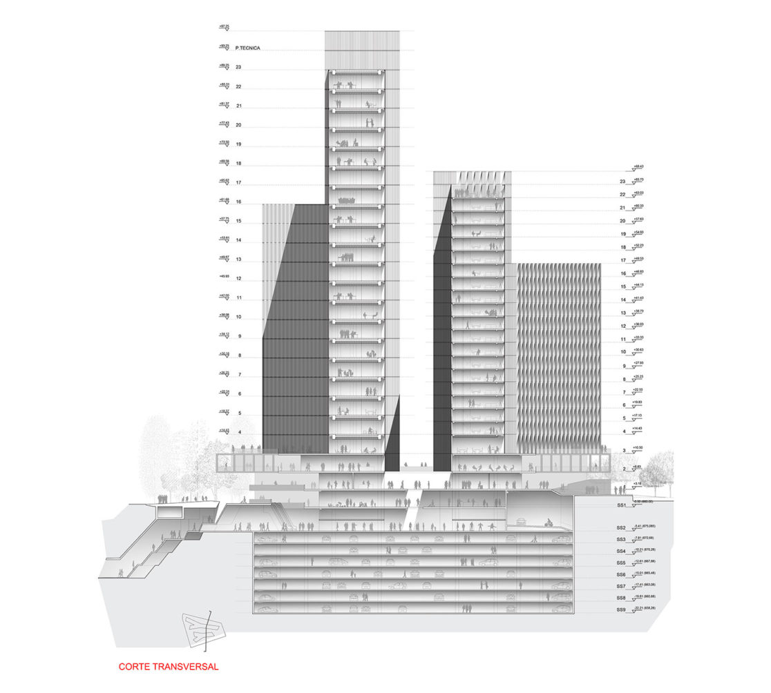 The commercial plate is set back between the two buildings, creating an entrance plaza to both the residential building and the office building, making this space into a vertical hall almost 100 meters high, which is naturally illuminated by reflections from the north façade of the office building. On the level above the commercial plate, the floor has been allocated to a programmatic mix of co-work spaces in the residential building and a cafeteria-restaurant in the office volume, to take advantage of the large terraces generated on that level.