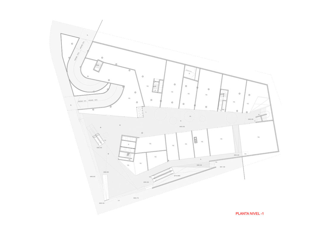 The structure is repetitive and continuous from the basement to the upper floors, based on columns, capitals, beams and slabs, with conventional bays. To solve the cantilever of the second floor of the commercial plate, which frees the pedestrian floor from obstacles and creates a double-height public atrium, a steel virendel beam was used. The break in the residential building and the change of direction of the floors of the apartments, has been given vertical continuity at the intersection of the walls of one floor with the other.