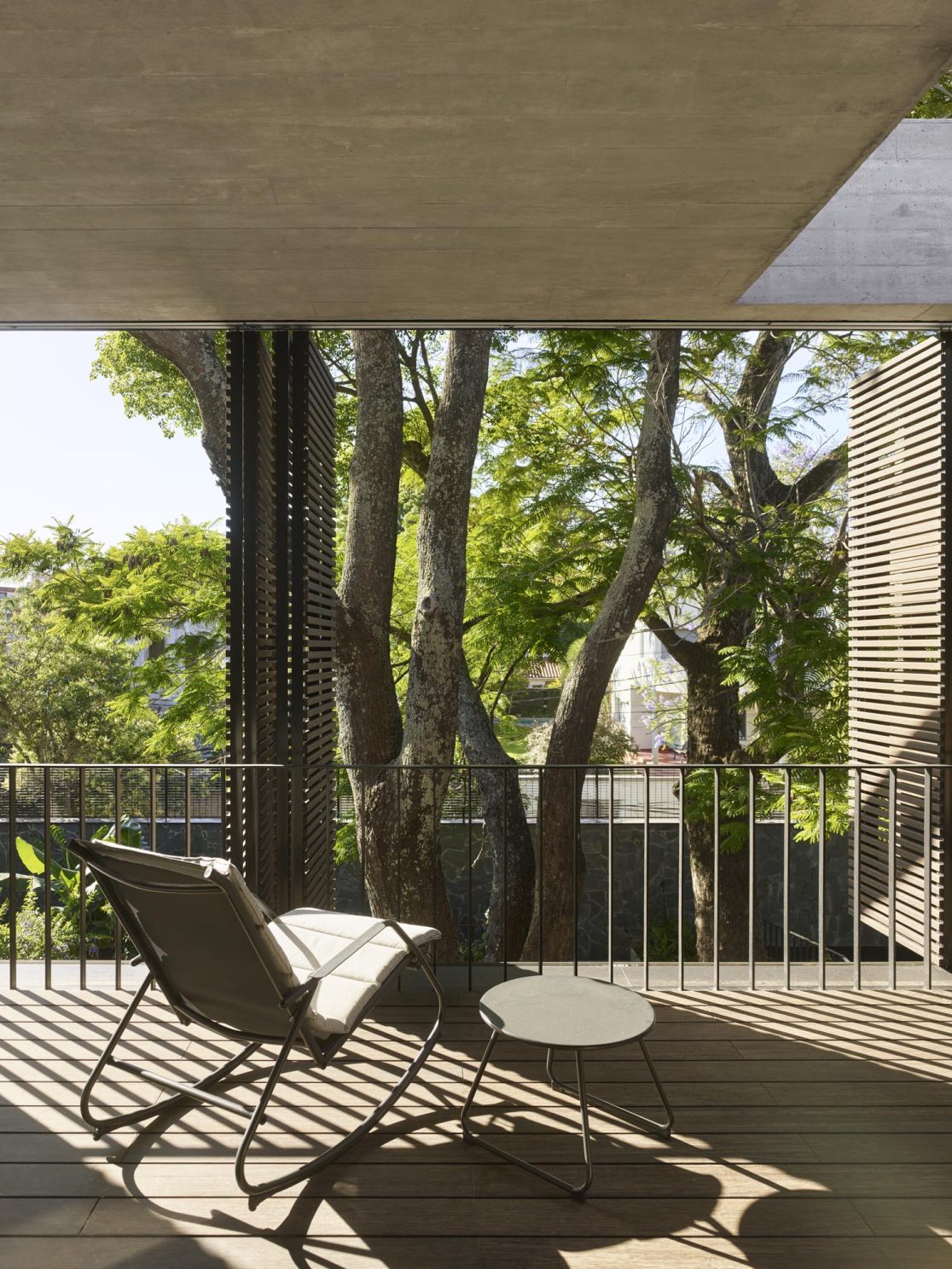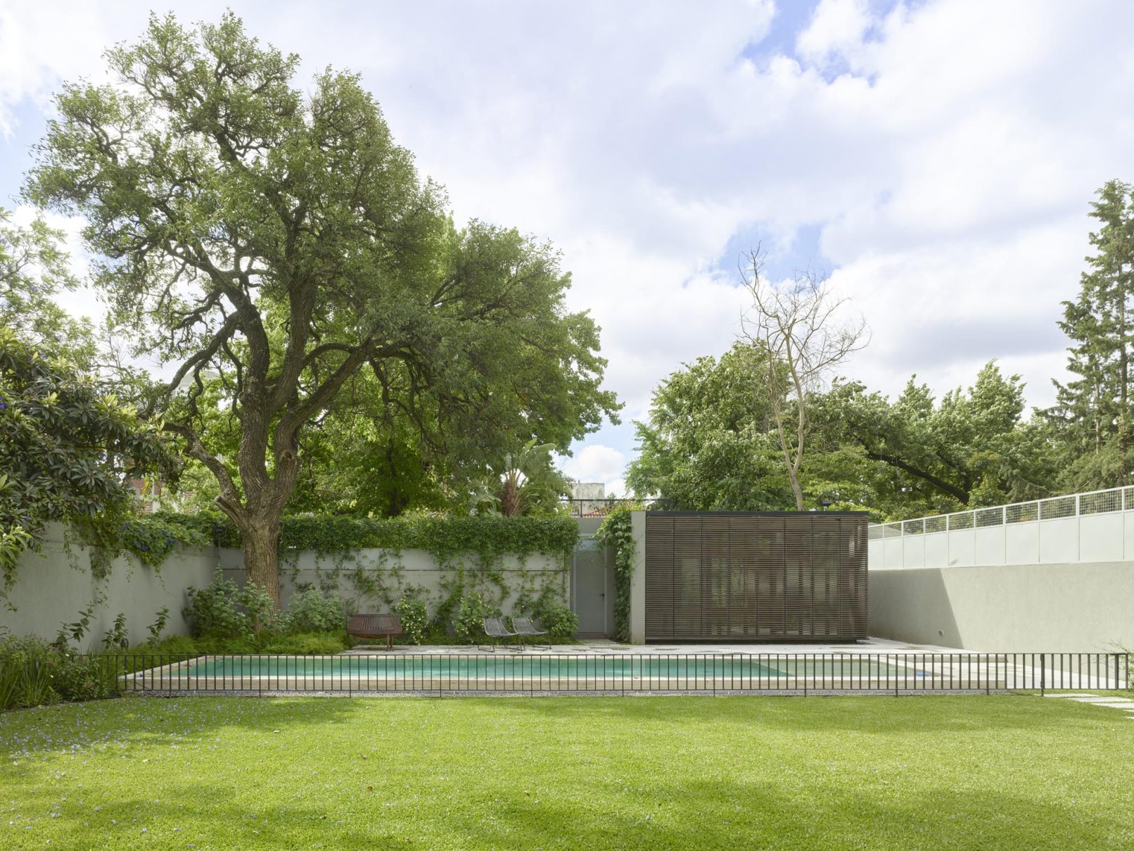 The bedrooms are located on the first floor, and the garage is located in the basement. The name of the house corresponds to a prominent pink lapacho tree located in the garden in front of the street, which determined the access route, the location of the master bedroom, and the access to the garage.