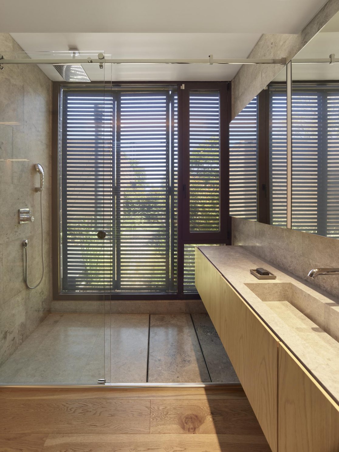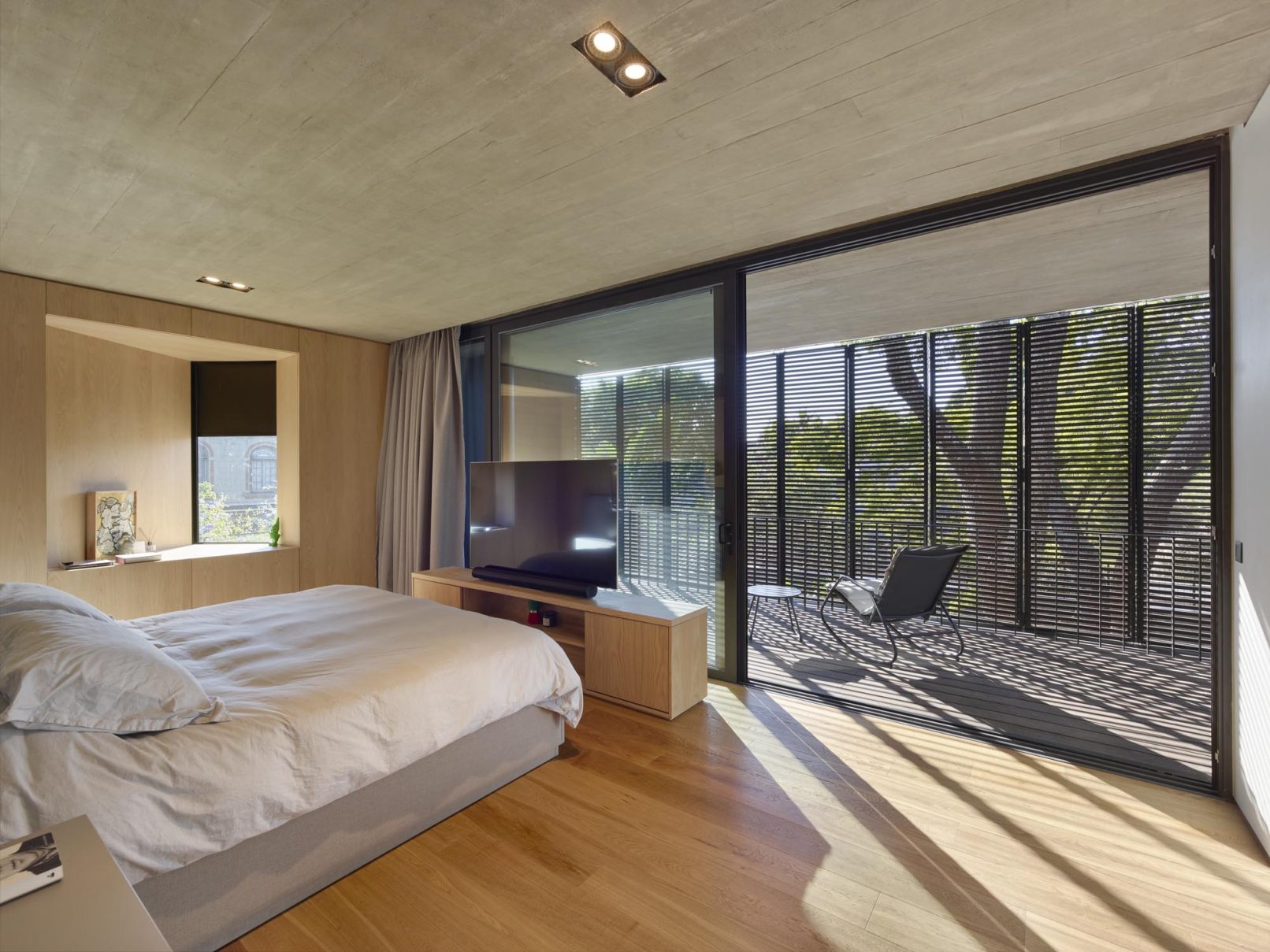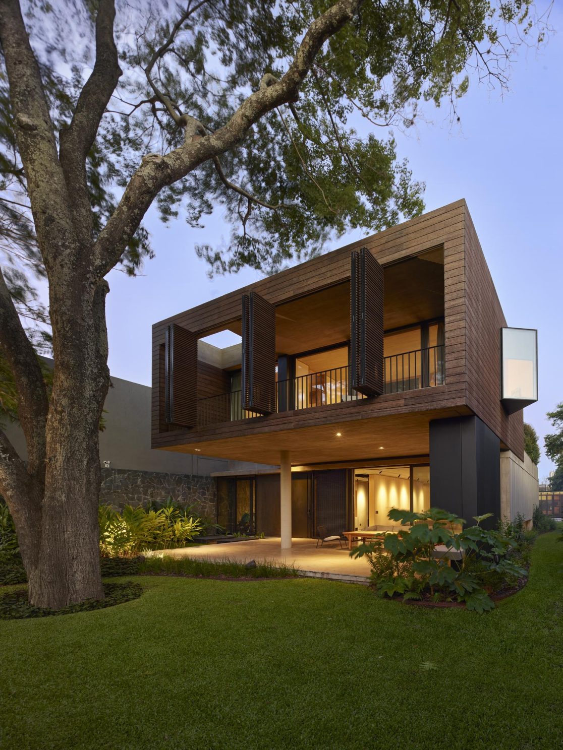 The house is materially conceived as wooden volumes on a concrete and glass base.