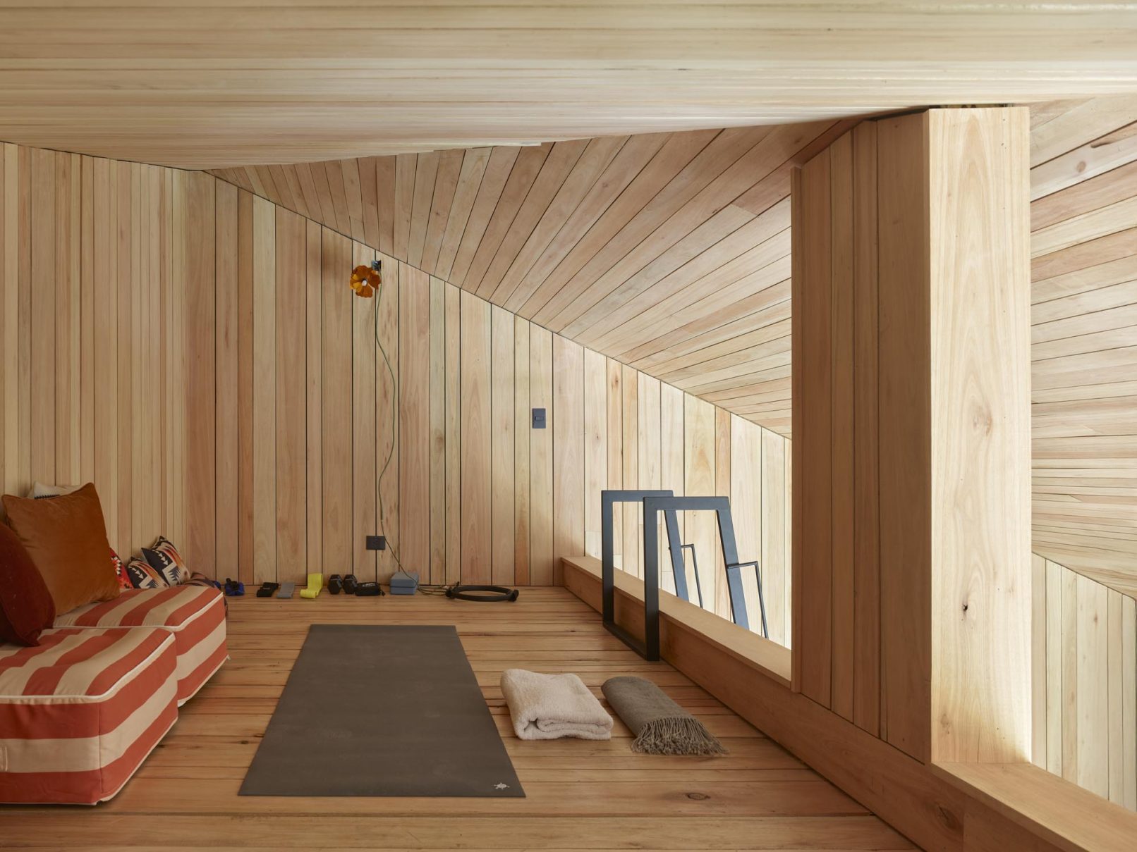 Inside, the house’s walls are clad in eucalyptus wood and the paving is made of local stone.