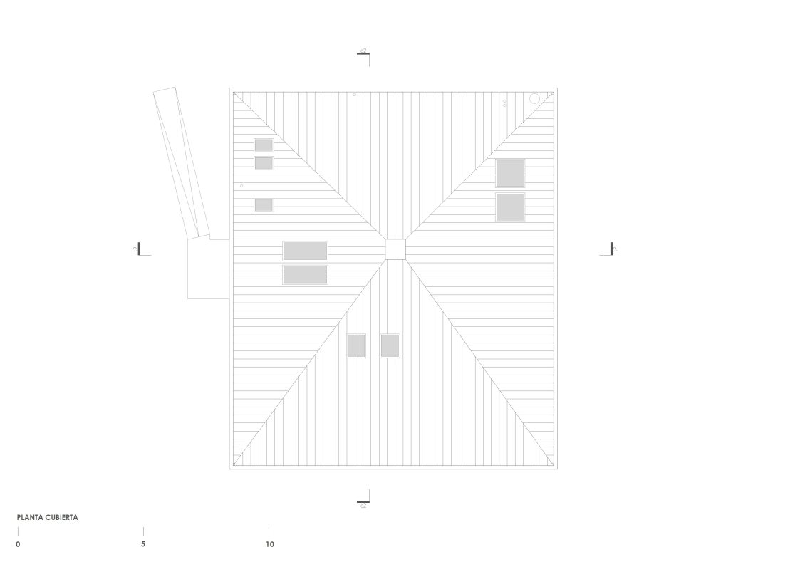 The project rests on a concrete platform, subtly raised from the ground, supporting a rectangular volume clad in corten steel and topped by an asymmetrical pyramidal roof of black sheet metal.