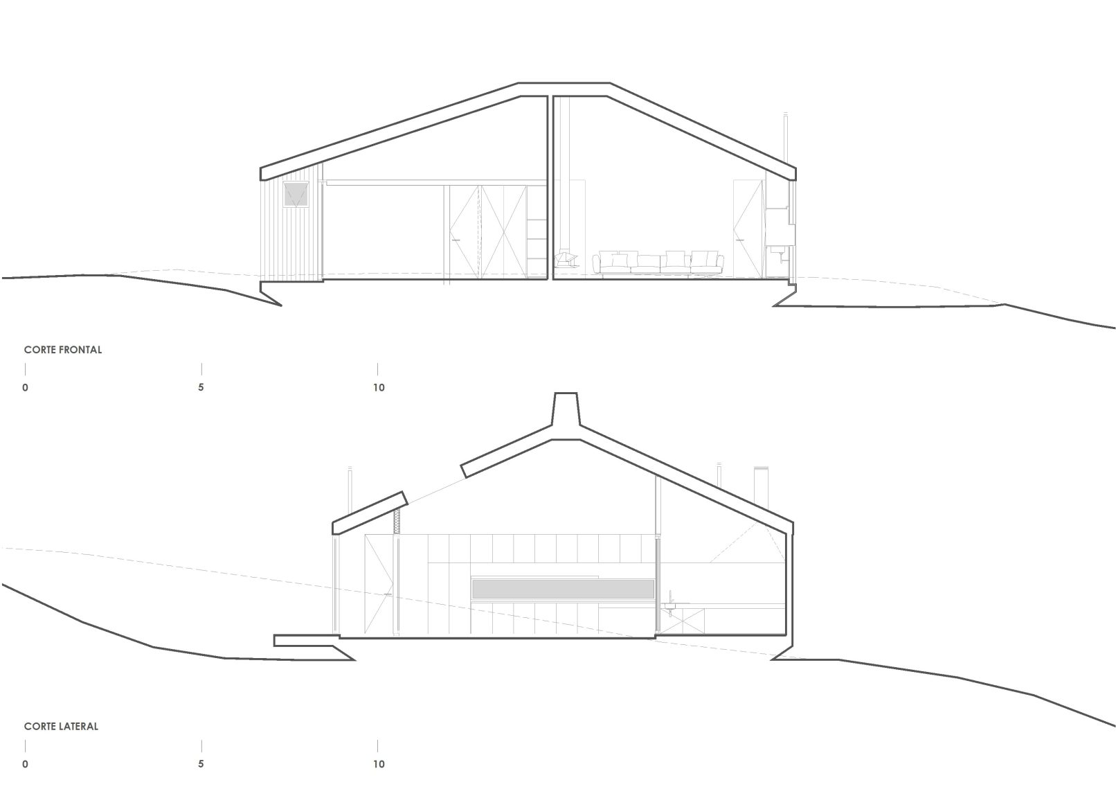 The project is a small, easy-to-maintain and operate cabin with a master bedroom, two guest bedrooms, and a communal living, dining room, kitchen, and barbecue area.