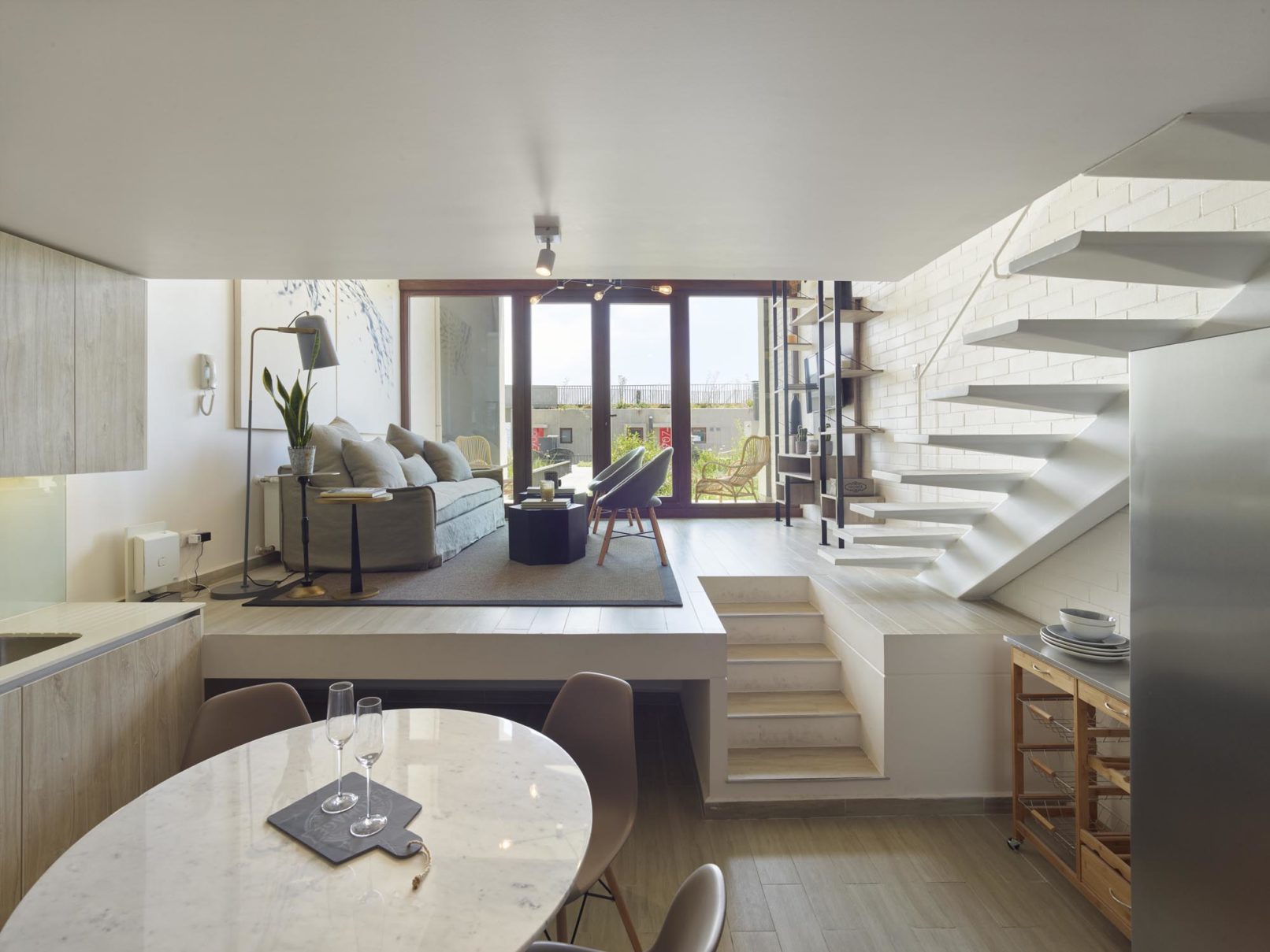 The project rebuilds the old Hospital, transforming it into apartments and builds four overlapping buildings on the terrain facing the sea, under the elevation of the old hospital, creating a public walkway on its deck, which is the extension of the Baron Elevator’s viewing platform.