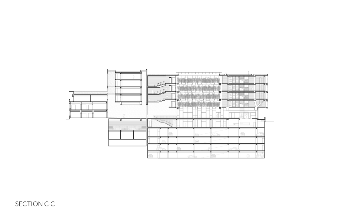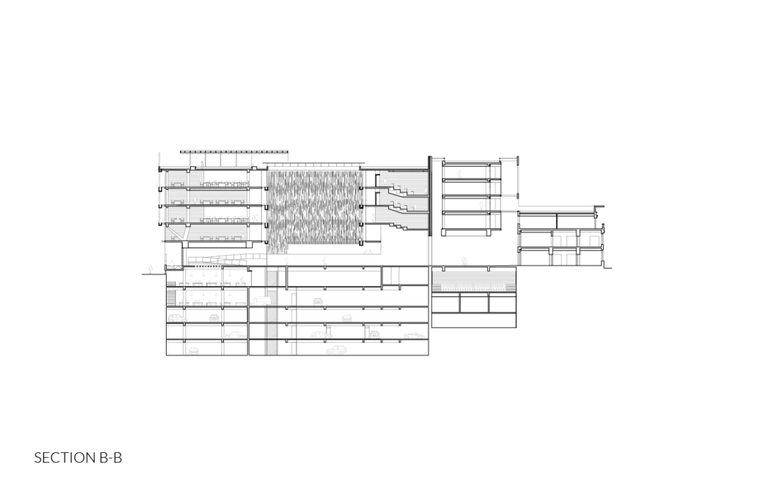 This is why we made the bottom of the classroom building a non-structural element, allowing it to be opened and connected at various points, thus allowing flow through the interior of the block, in an area saturated with pedestrians.