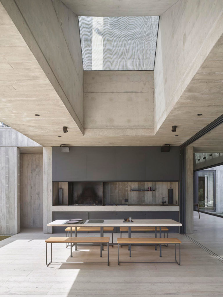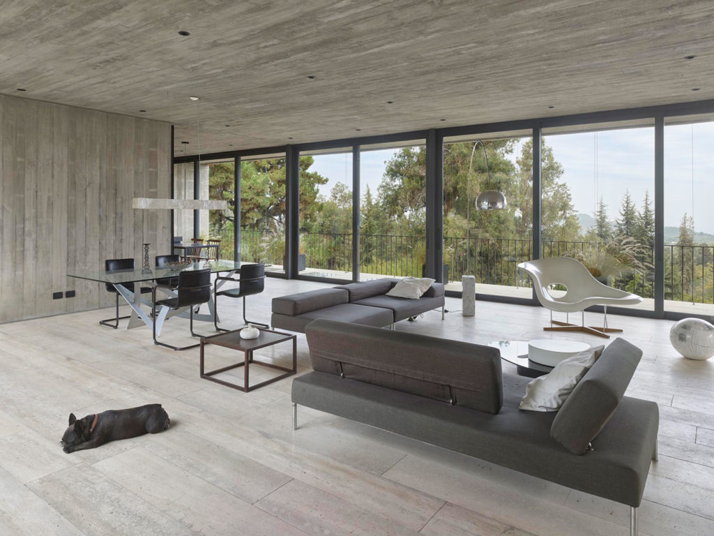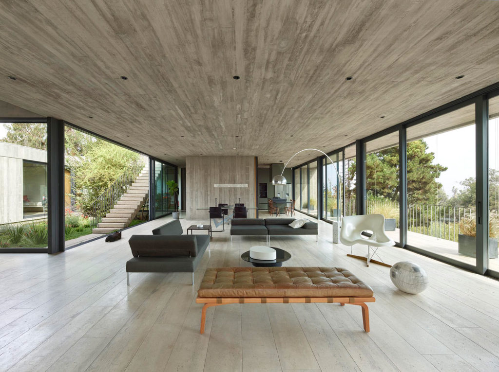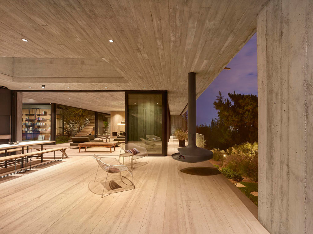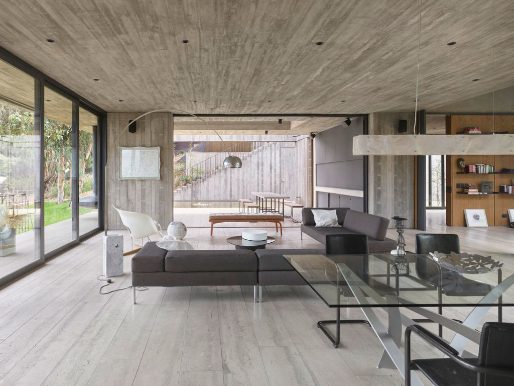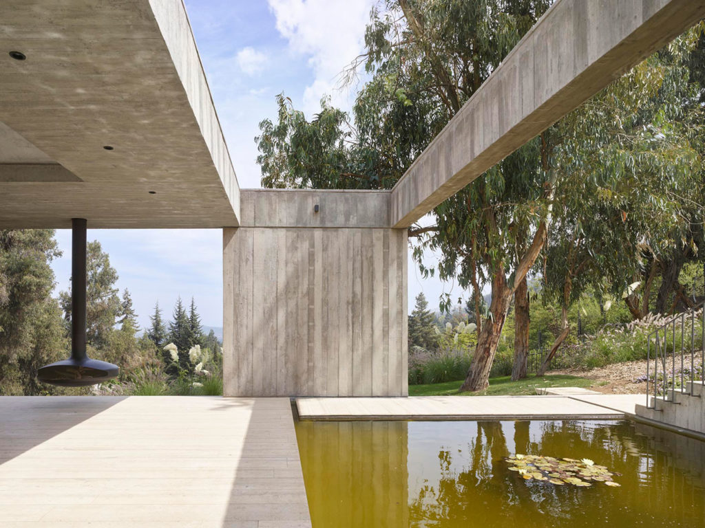 The materiality of the house is of exposed concrete, in ceilings and walls and travertine marble in the interior and exterior floors.