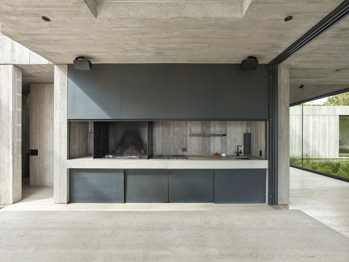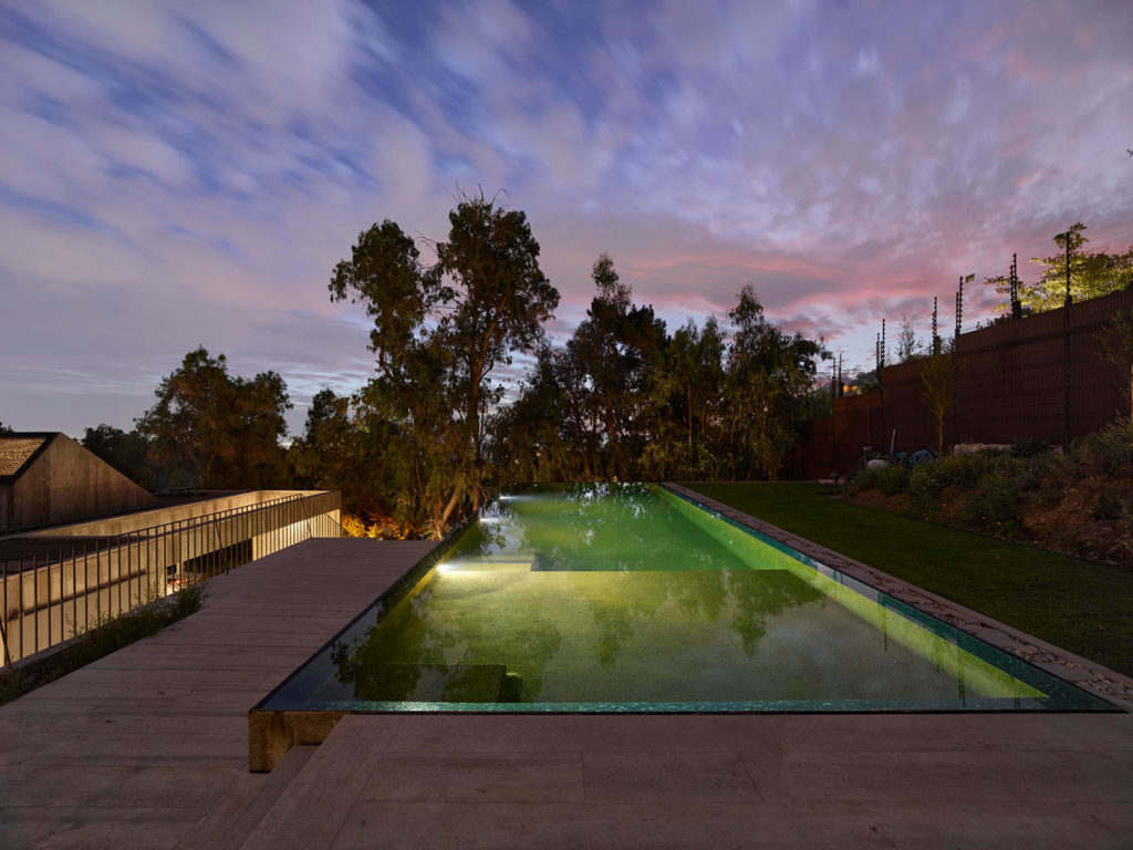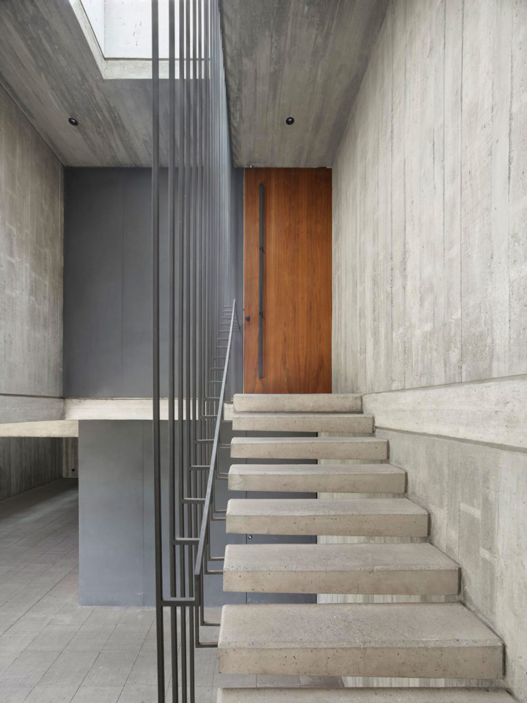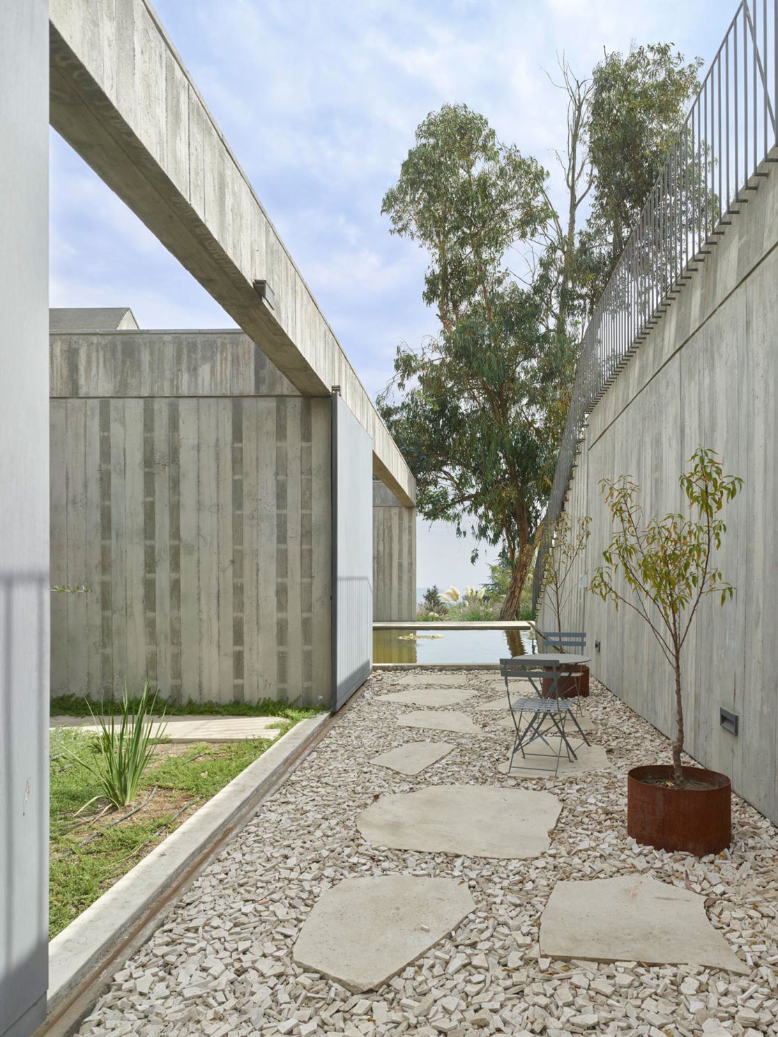 The materiality of the house is of exposed concrete, in ceilings and walls and travertine marble in the interior and exterior floors.