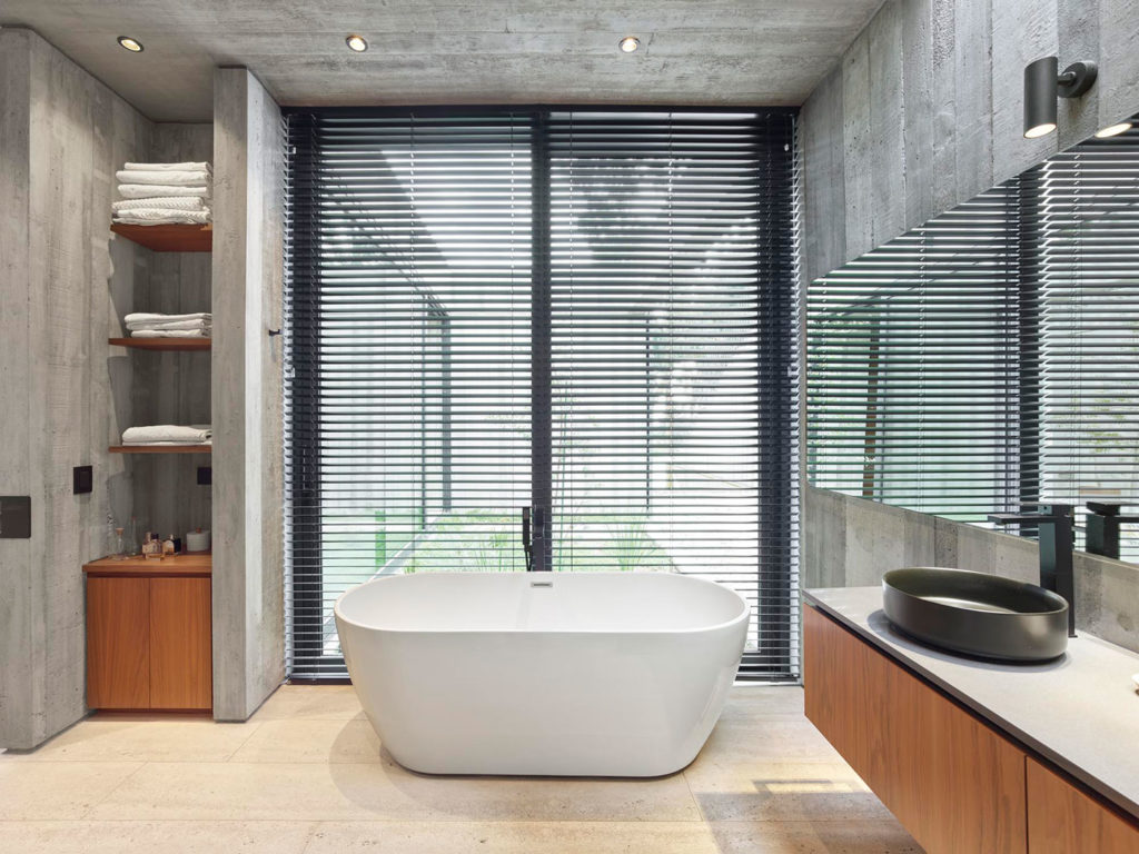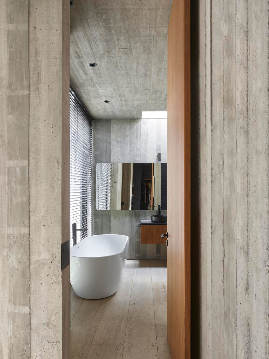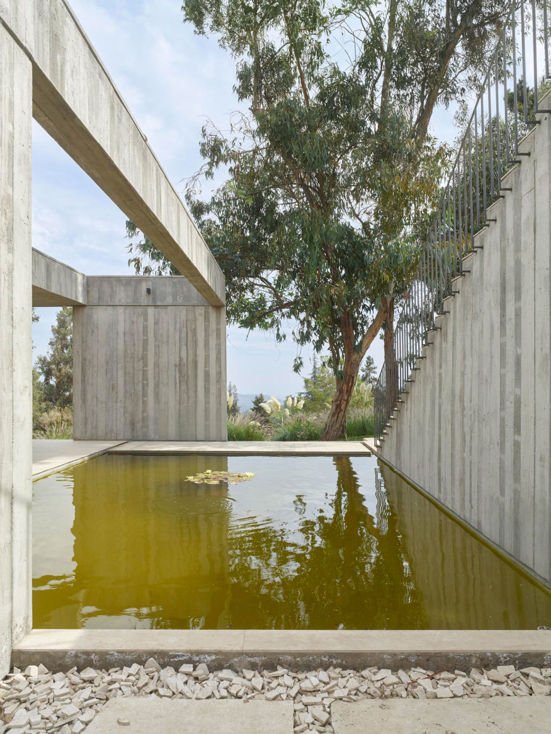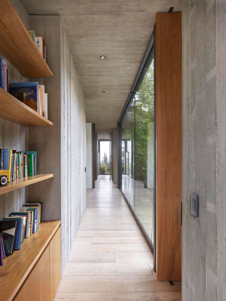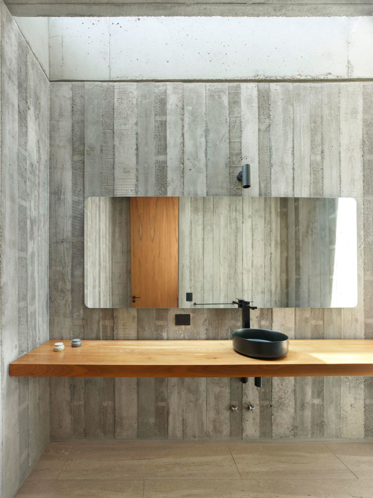 The materiality of the house is of exposed concrete, in ceilings and walls and travertine marble in the interior and exterior floors.
