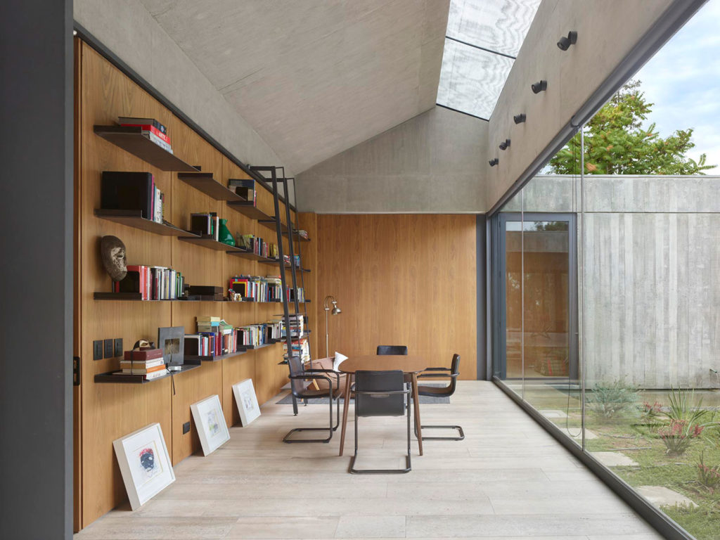 To give it warmth, wood appears as a complement in doors, furniture and some waals as the book library.