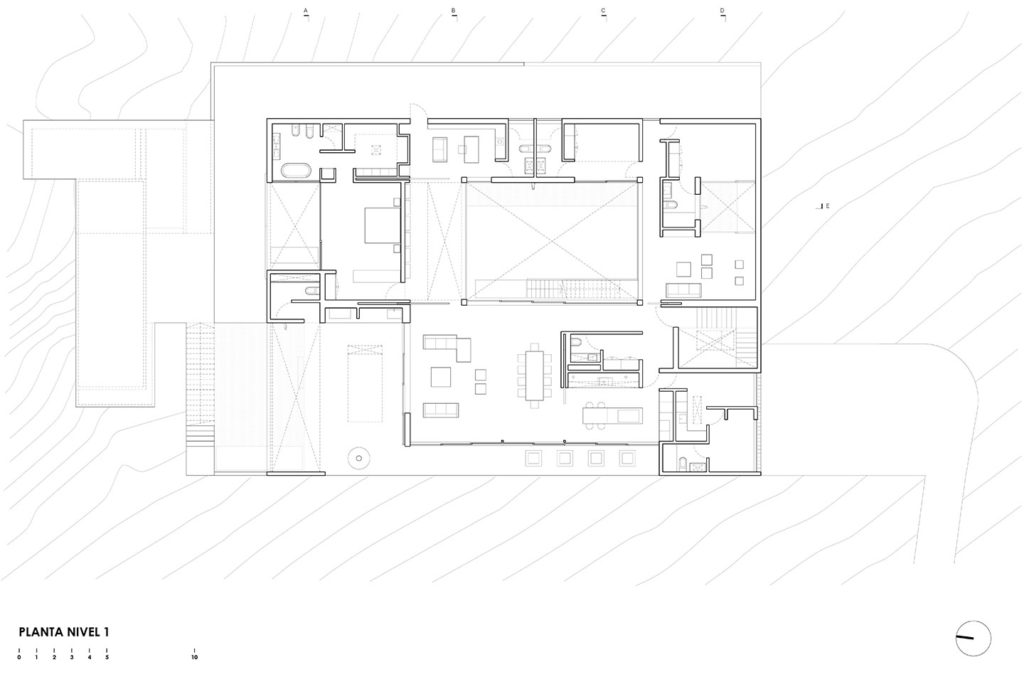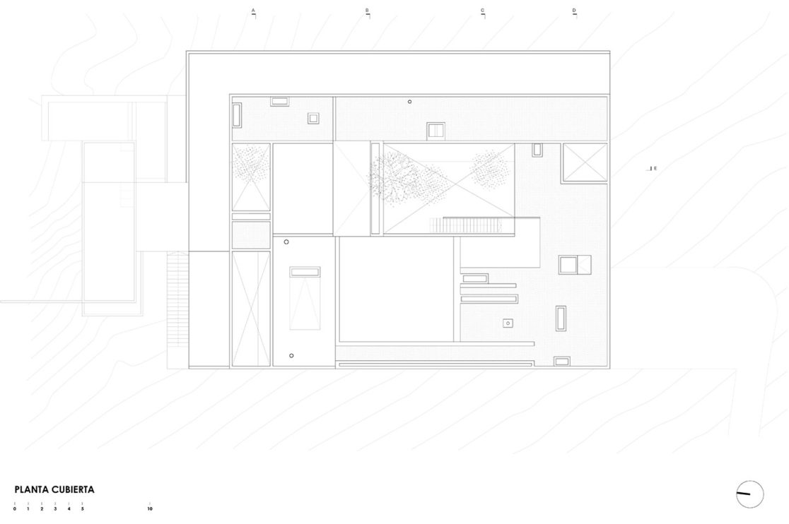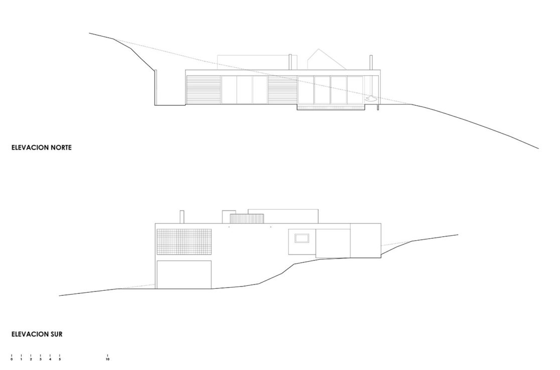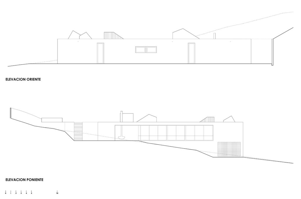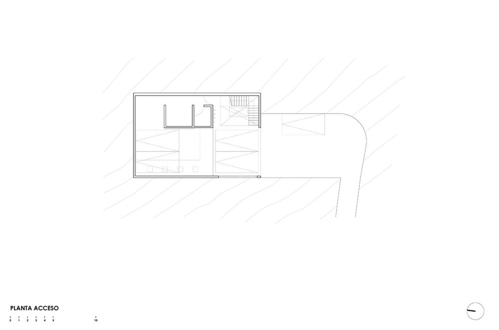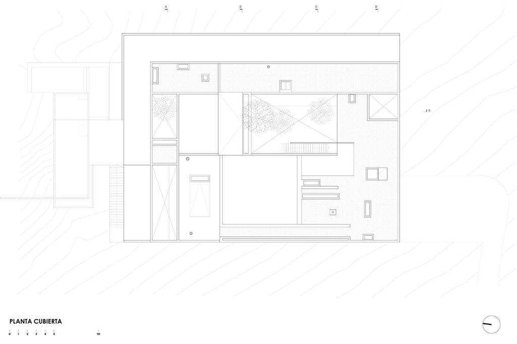 As a complement to this main level, the access, the garage and the machine room were left on the ground floor, and at the roof level, a garden and the pool, taking advantage of the slope that develops in two axes of the volume.