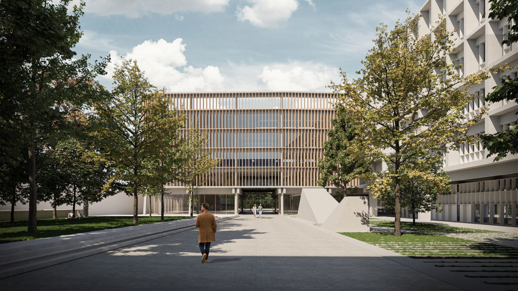 Proyectamos un edificio que vincula La plaza de El Salvador con el Patio Interior y a su vez enlaza los edificios existentes creando un circuito de comunicación eficiente convirtiendo al campus en un solo organismo.