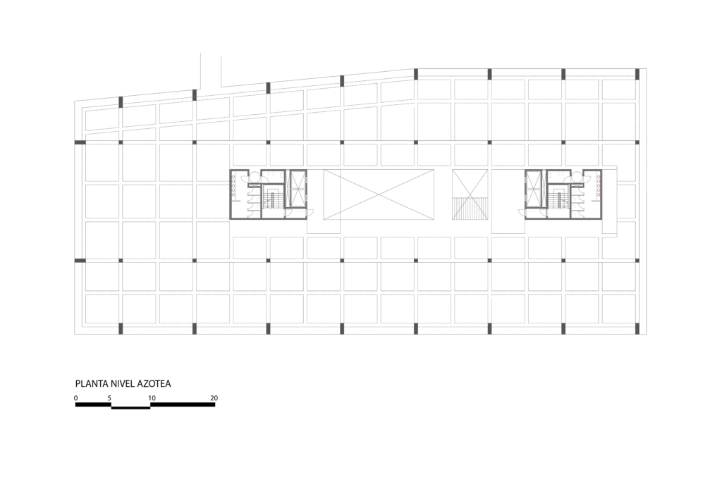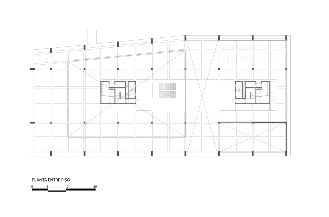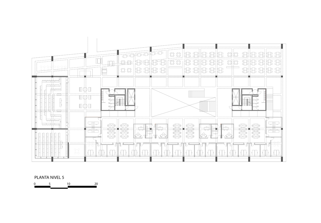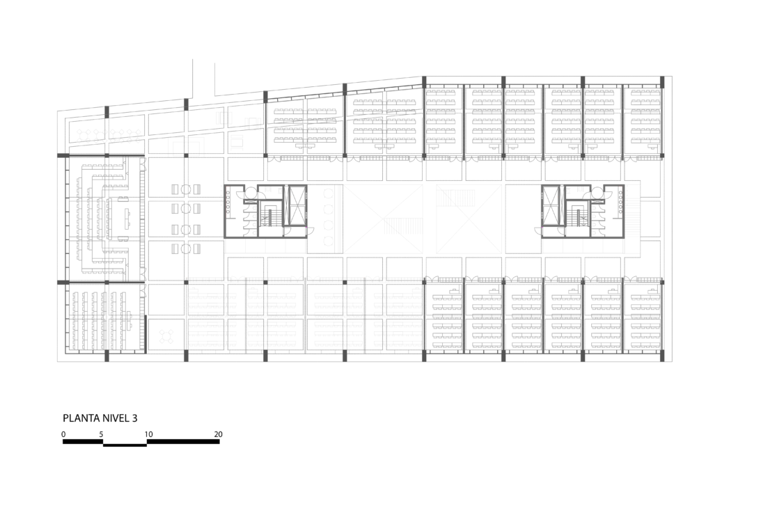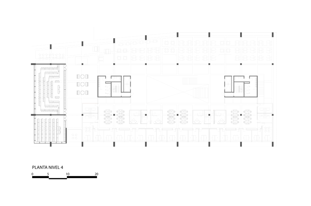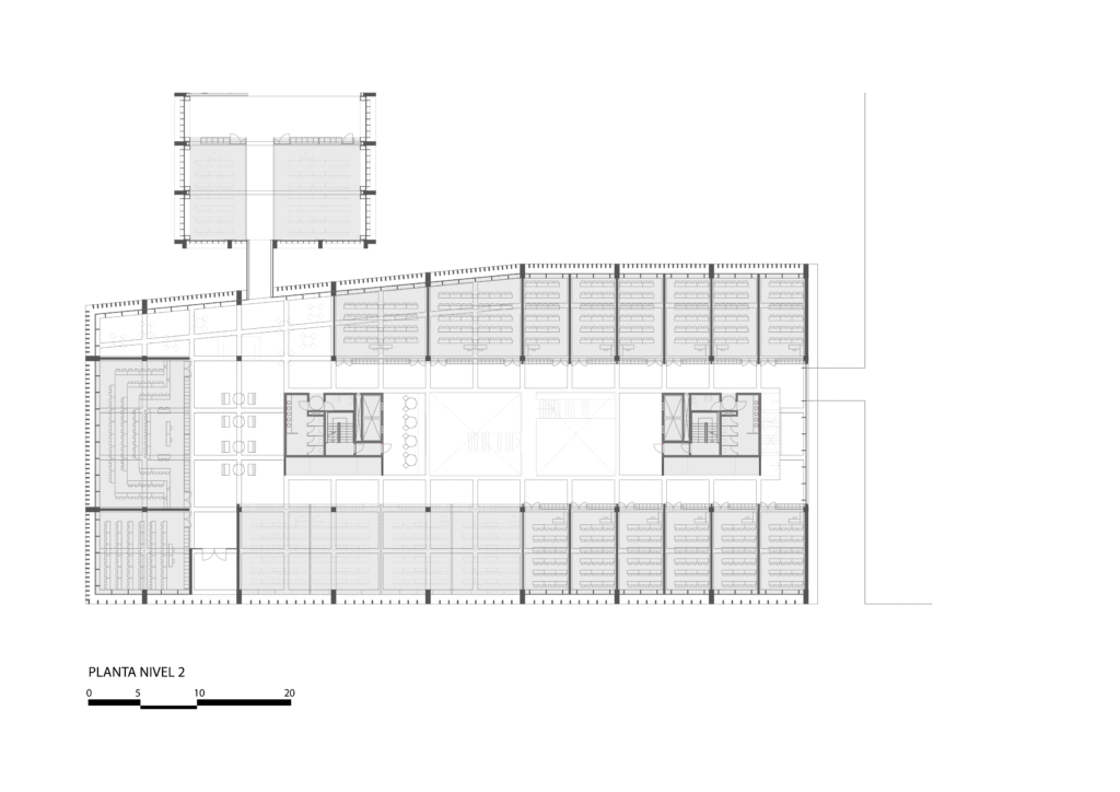 La estructura define una planta tipo con una modulación apta para desarrollo de aulas, a su vez contemplando la versatilidad de poder armar distintas configuraciones acordes a los futuros cambios tanto funcionales como programáticos.